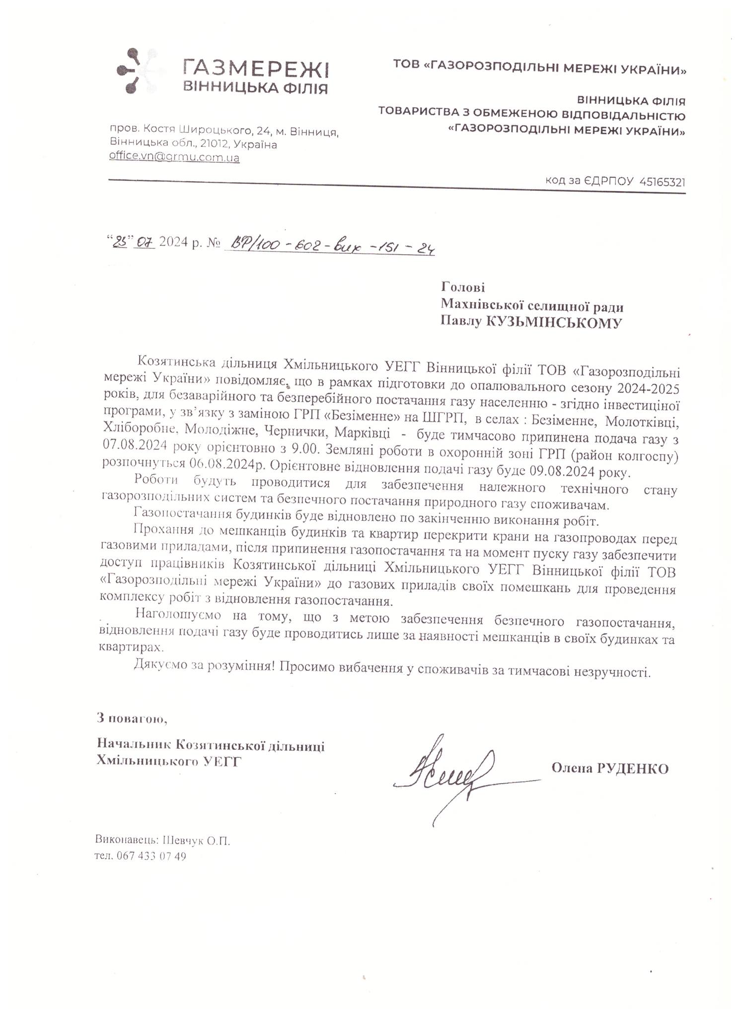 - Козятинська дільниця Вінницької філії «Газорозподільних мереж» повідомляє про тимчасове припинення газопостачання на території Махнівської громади.