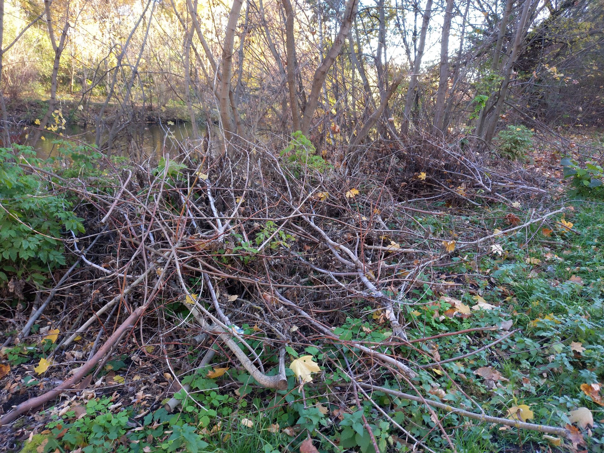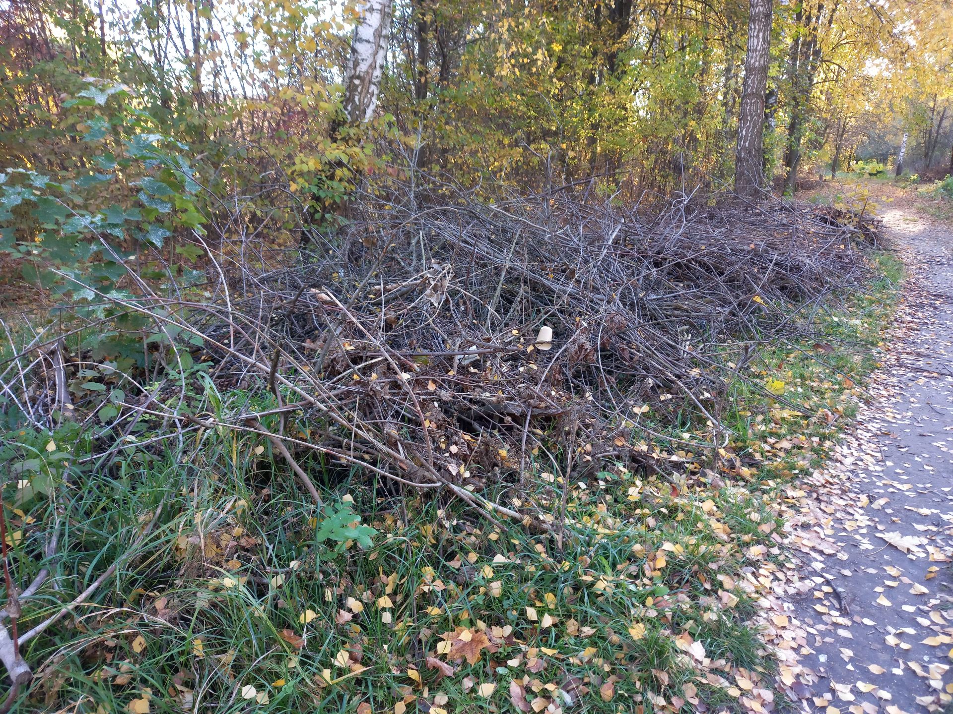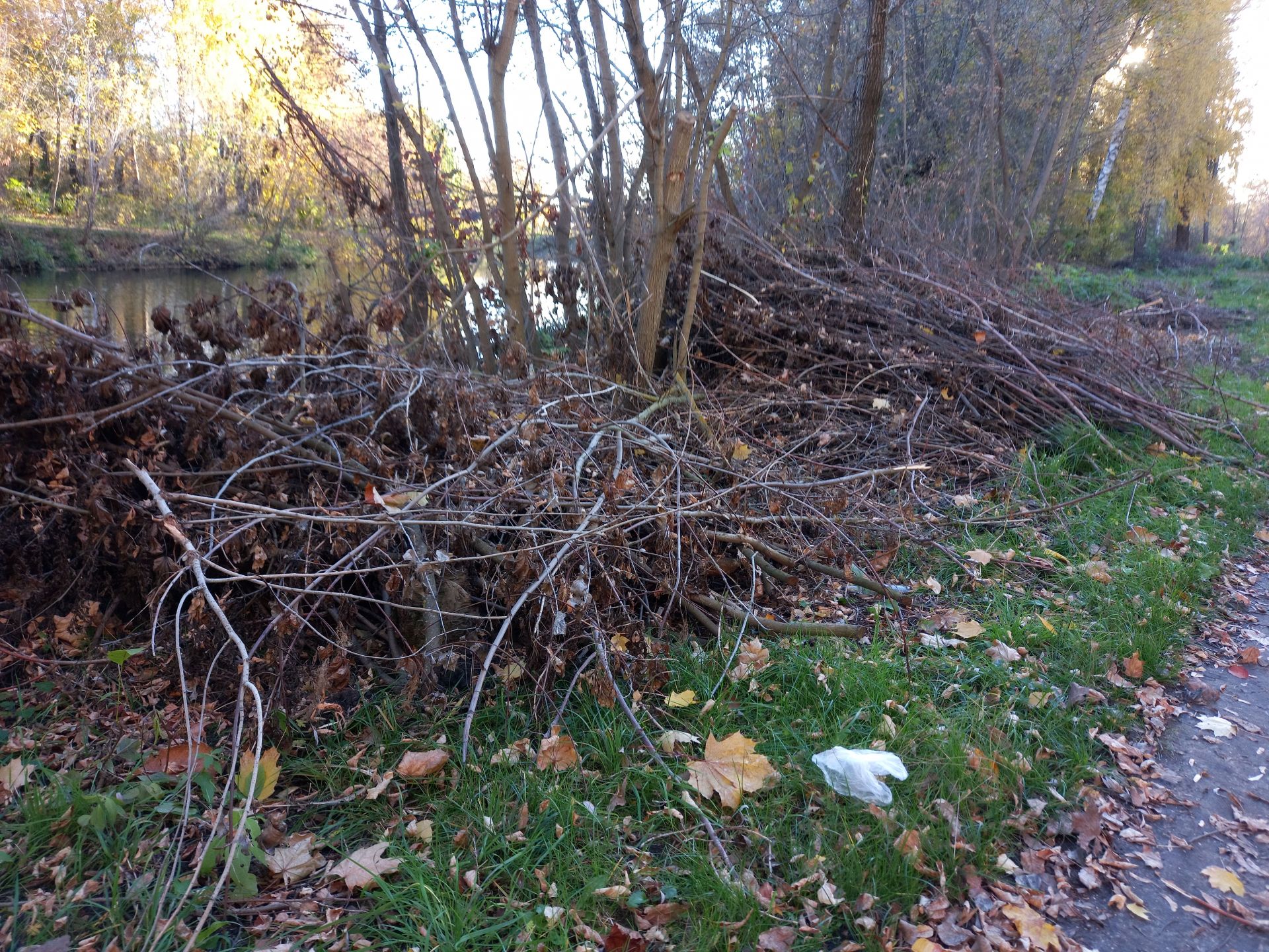 Не так давно на Водокачці обабіч стежки, яка веде від паркованки за стадіоном вглиб острова, рясно росли кущі. Роками їх ніхто не зачіпав, навіть не пригадуємо, щоб їх колись підстригали. Тож кущі росли собі декілька метрів заввишки, створюючи влітку приємний затінок. А цьогоріч їх вирішили розчистити і зрізали під корінь. Було це ще влітку. Зрізати зрізали, а гілки, замість того, щоб вивезти з острова, залишили на березі Водокачки.