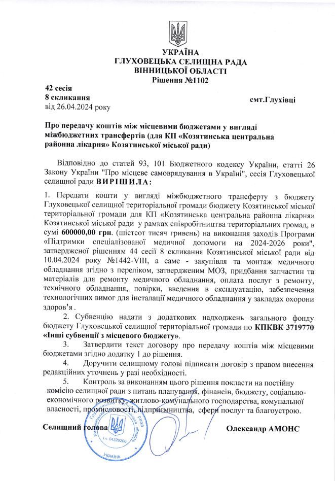 Таке рішення депутати Глуховецької селищної ради ухвалили у рамках виконання погодженої програми міжмуніципального співробітництва «Підтримки спеціалізованої медичної допомоги на 2024-2026 роки», що була затверджена місяцем раніше депутатським корпусом Козятинської міської ради.