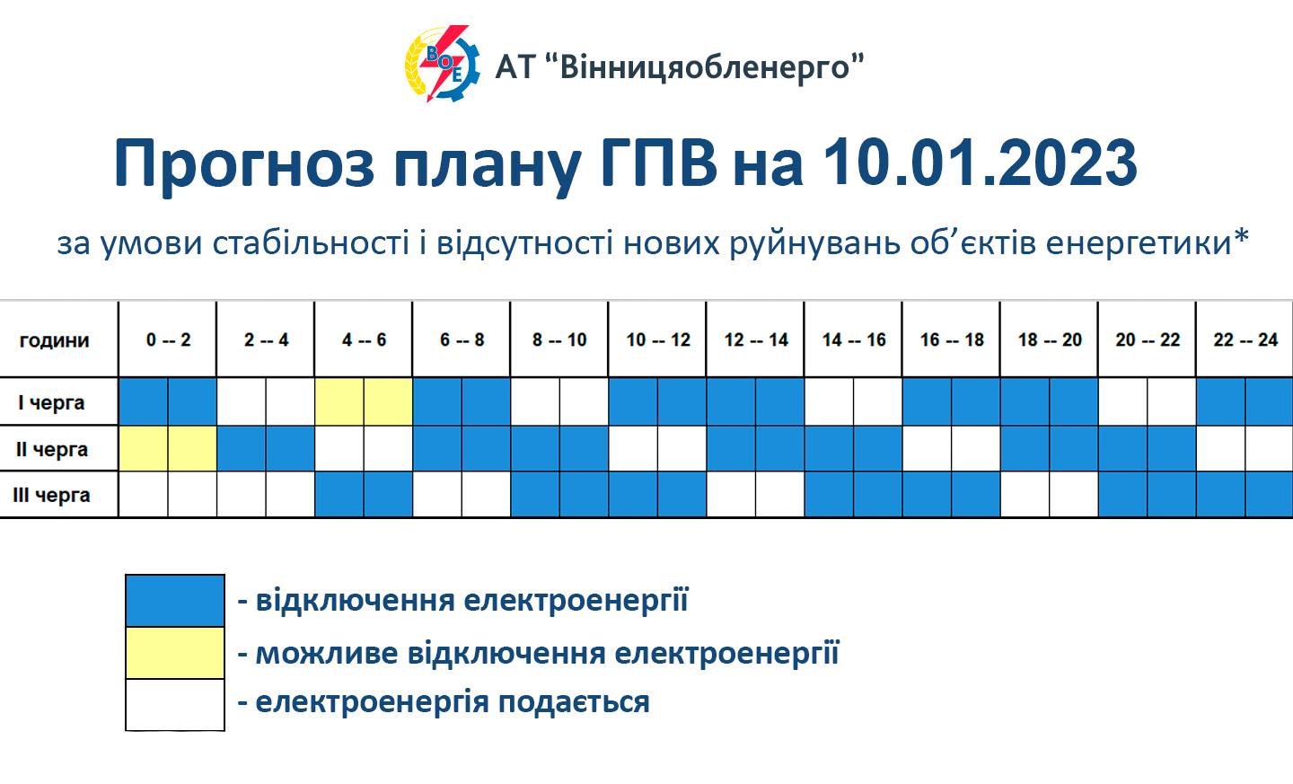 — Відповідно до доведеної граничної величини споживання електричної потужності на 10.01.23 р. по Вінницькій області задіяли обмеження електроспоживання відповідно до графіка погодинного відключення ГПВ, — повідомляє Вінницяобленерго