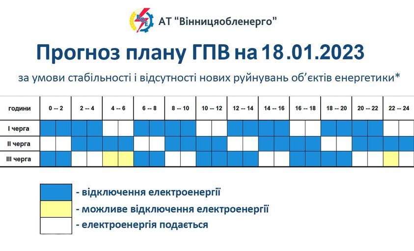 Відповідно до доведеної граничної величини споживання електричної потужності на 18.01.23 р. по Вінницькій області задіяли обмеження електроспоживання відповідно до графіка погодинного відключення ГПВ: