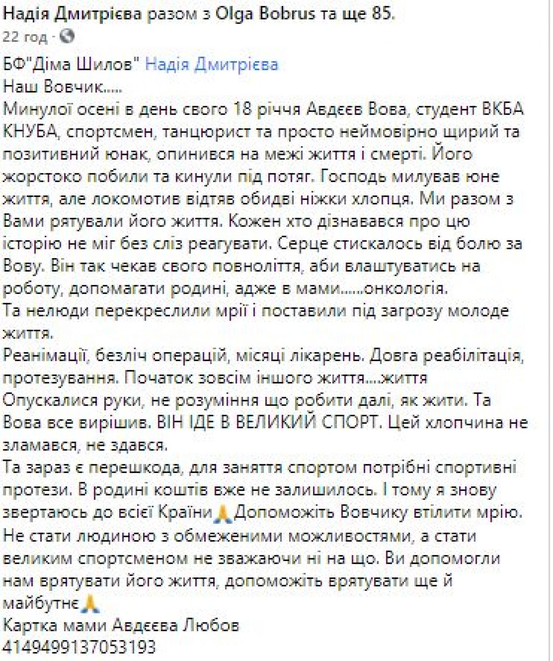 — Цей хлопчина не зламався, не здався. Вова все вирішив — він іде у великий спорт. Та зараз є перешкода, для заняття спортом потрібні спортивні протези. В родині коштів вже не залишилось. І тому я знову звертаюсь до всієї Країни Допоможіть Вовчику втілити мрію. Не стати людиною з обмеженими можливостями, а стати великим спортсменом не зважаючи ні на що. Ви допомогли нам врятувати його життя, допоможіть врятувати ще й майбутнє, — йдеться у дописі