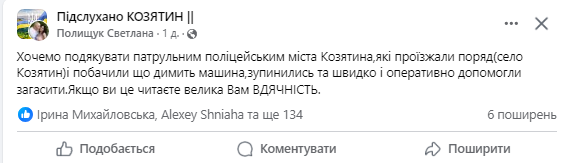 — Хочемо подякувати патрульним поліцейським міста Козятин, які проїжджали поряд, побачили, що димить машина, зупинились і швидко та оперативно допомогли загасити Велика вам вдячність, — йдеться у дописі Світлани.