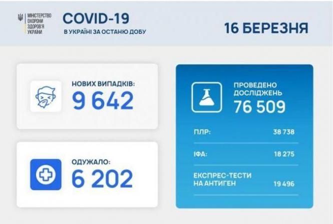 Станом на ранок 16 березня в Україні виявили + 9 642 нових випадки коронавірусної хвороби COVID-19. На Вінниччині — + 924 випадки.