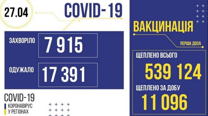 Станом на ранок 27 квітня в Україні за добу виявили 7 тисяч 915 нових випадків, з них 134 на Вінниччині.