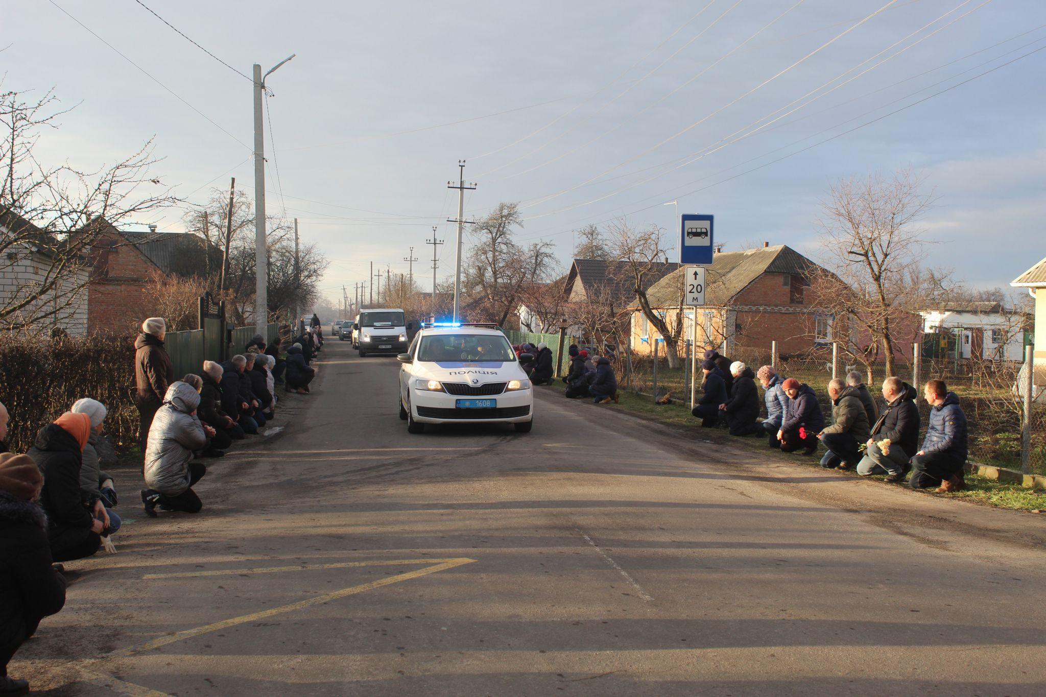 Почалася траурна процесія з живого коридору по вулицею Бандери (колишня Матросова) та вулицею Польовою (колишня Петра Кривоноса) о 9-й годині. Ми стояли біля будинку Юрія Фоміна і бачили, сльози на очах його сусідів.