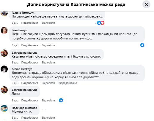 — Нагадую, що на озеленення громади використовуються кошти, що надійшли від сплати податків з надходжень від охорони навколишнього середовища. Використати їх не за призначенням неможливо. Також хочу запевнити, що ми продовжуємо активно підтримувати наших захисників. На ці потреби у міському бюджеті передбачено 50 мільйонів гривень, які за потреби будуть використанні на придбання техніки, дронів та інших засобів оборони, — додає Ірина Репало у повідомленні