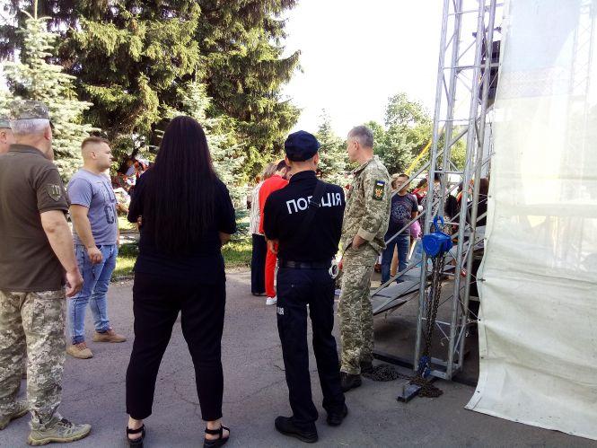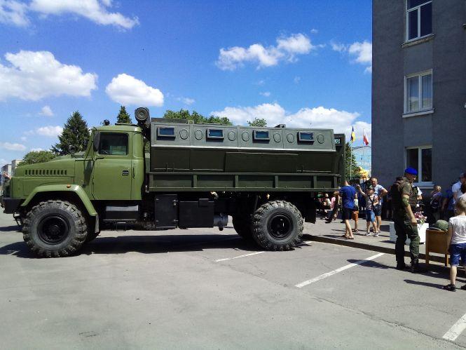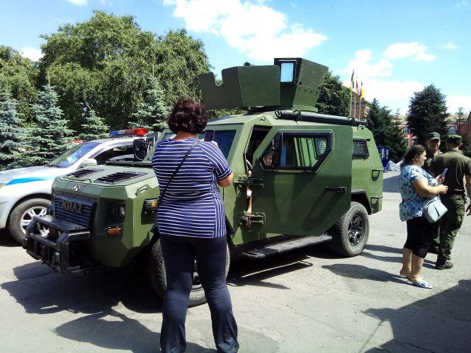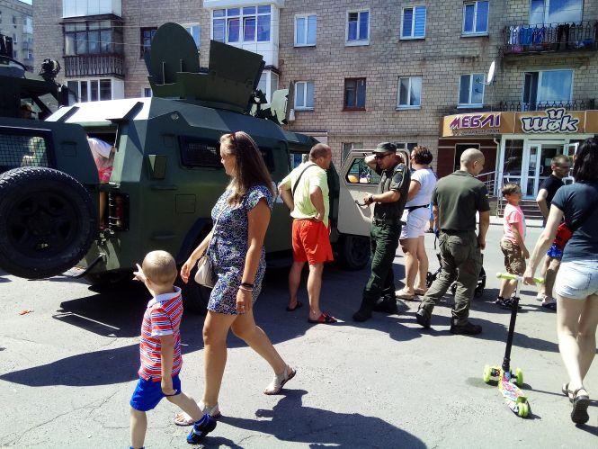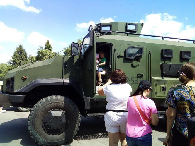 Удень на площі діяло три виставки. Вздовж проїжджої частини вишикувалася техніка нацгвардії. На бойові машини можна було не лише подивитися, а й посидіти всередині, зробити фото і натиснути на клаксон.