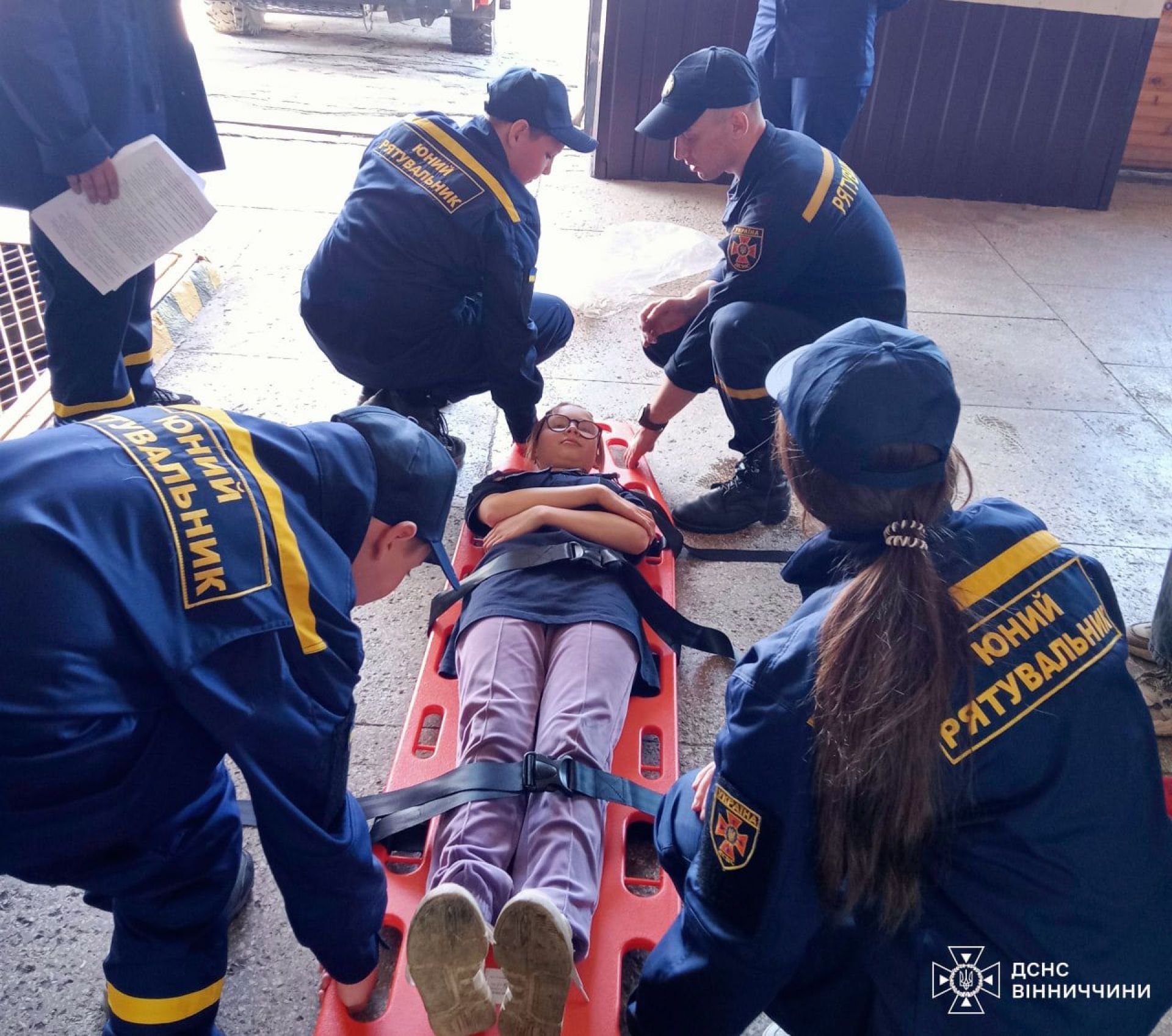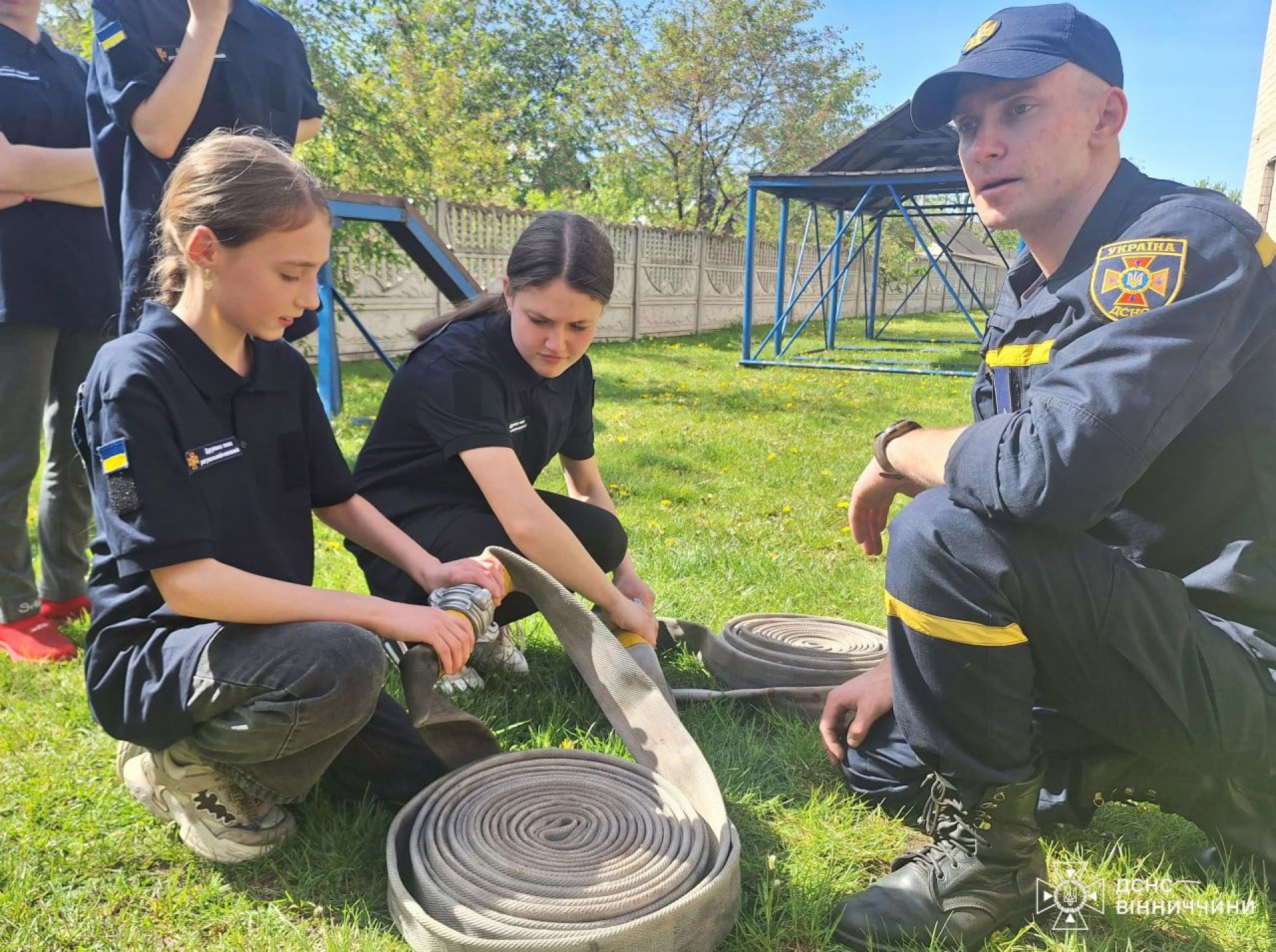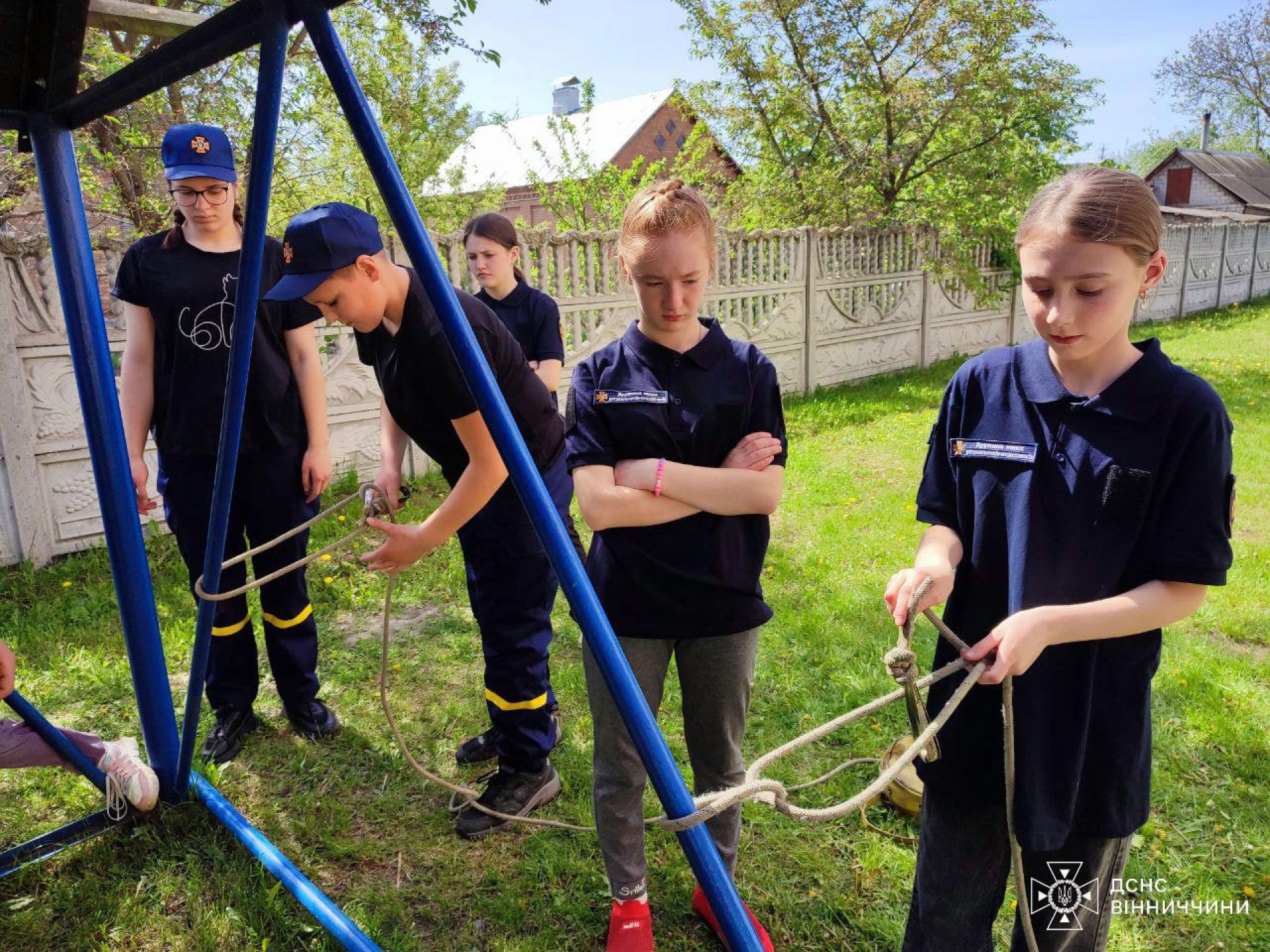 - Діти вивчали не лише як з'єднувати пожежні рукави та ліквідовувати умовну пожежу, а й тренувалися в'язати рятувальні вузли та як надійно фіксувати мотузку на умовному потерпілому та ношах при порятунку людини.