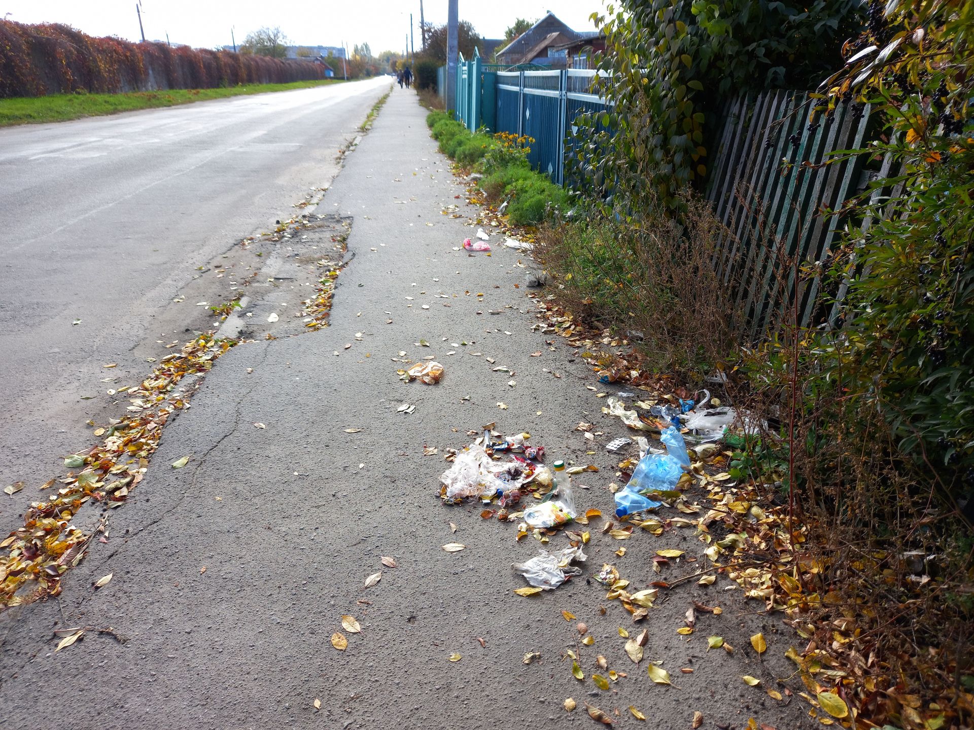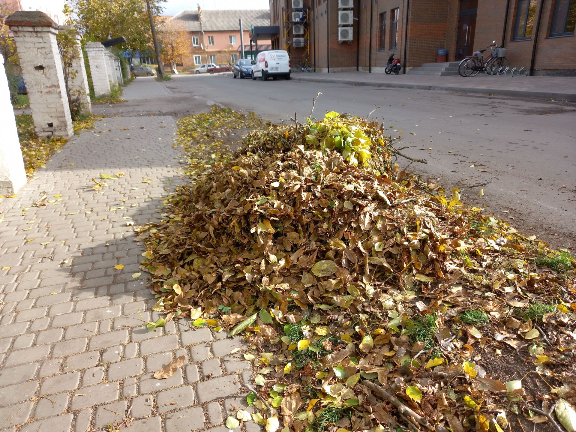 На початку вулиці Єдності (колишня Катукова) на тротуарі лежать купи листя. На перший погляд може здатися, що його згорнули, та насправді це вітер наніс листя, що опало з горіха навпроти. А люди, в свою чергу, докидали стаканчиків від кави.