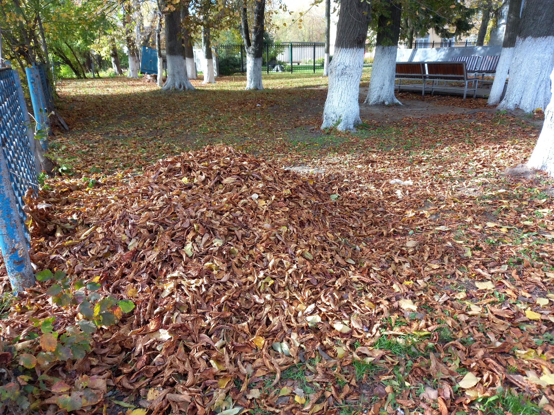 Де можна купатися в листі — так це біля залізничного училища. Під парканом навчального закладу рясно обсипався клен і жовте листя хрустить під ногами.