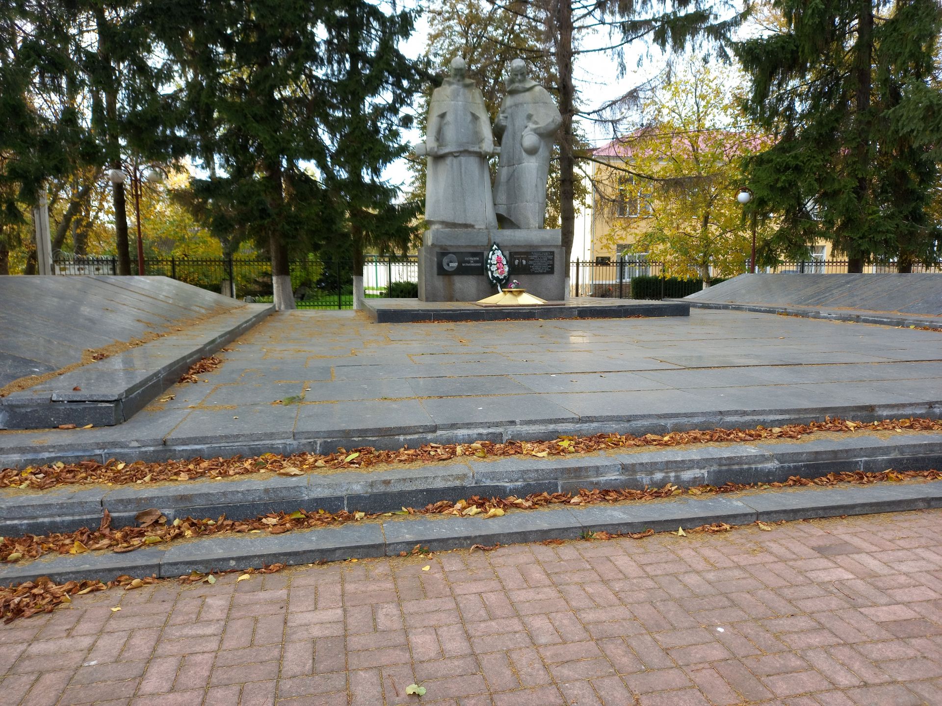 У сквері біля пам’ятника воїнам, загиблим у Другій світовій війні, трохи насипало листя з каштанів. Та, схоже, його тут нещодавно все таки згортали — під парканом невелика гірка. Її також ще не встигли вивезти. Бля самого пам’ятника не завадило б прибрати — жовті гілочки ялинок і пожовкле листя каштанів всипало сходи, територію перед монументом і гранітні плити, на яких викарбувані імена солдат.