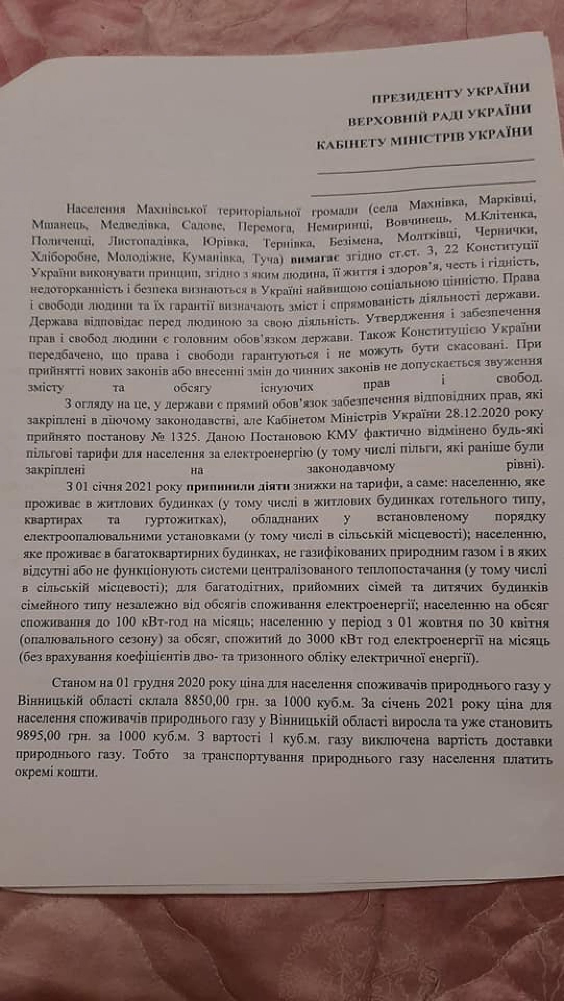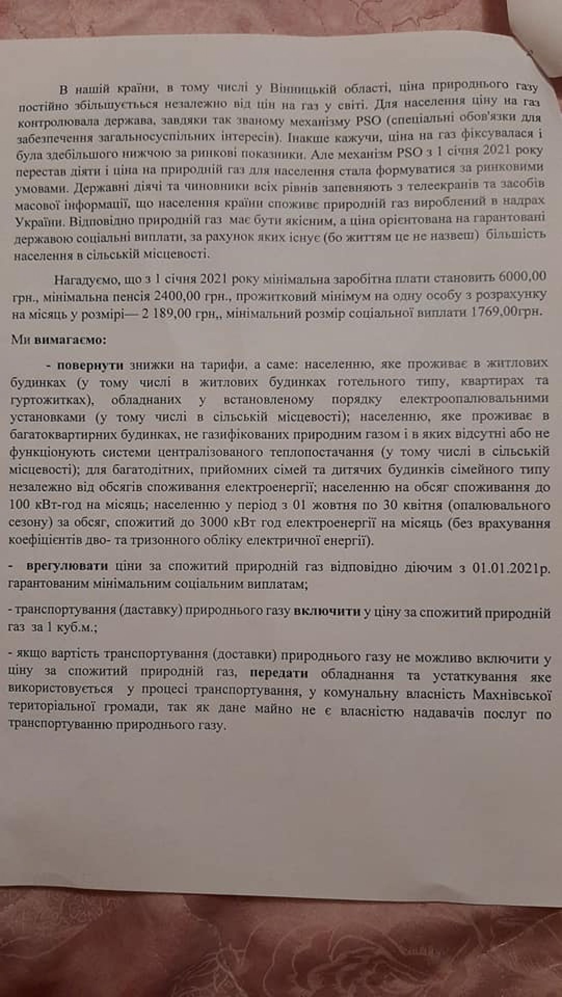 Зібралися 15 січня близько трьох десятків людей. На порядок денний вони винесли два питання. Одні стояли на думці, щоб до них дослухались треба перекрити трасу. Менша частина від зібравших стояли на позиції, нас мало ми не зможемо заблокувати рух транспорту. Подискусувавши у форматі, хто «за» хто «проти», більшість погодилась з пропозицією меншості, щоб йти до сільської ради. Там написали звернення до керівництва держави щодо зменшення тарифів на комунальні послуги. З цим документом місцеві депутати мають пройтися по всім вулицям махнівської громади і скріпити його підписами.