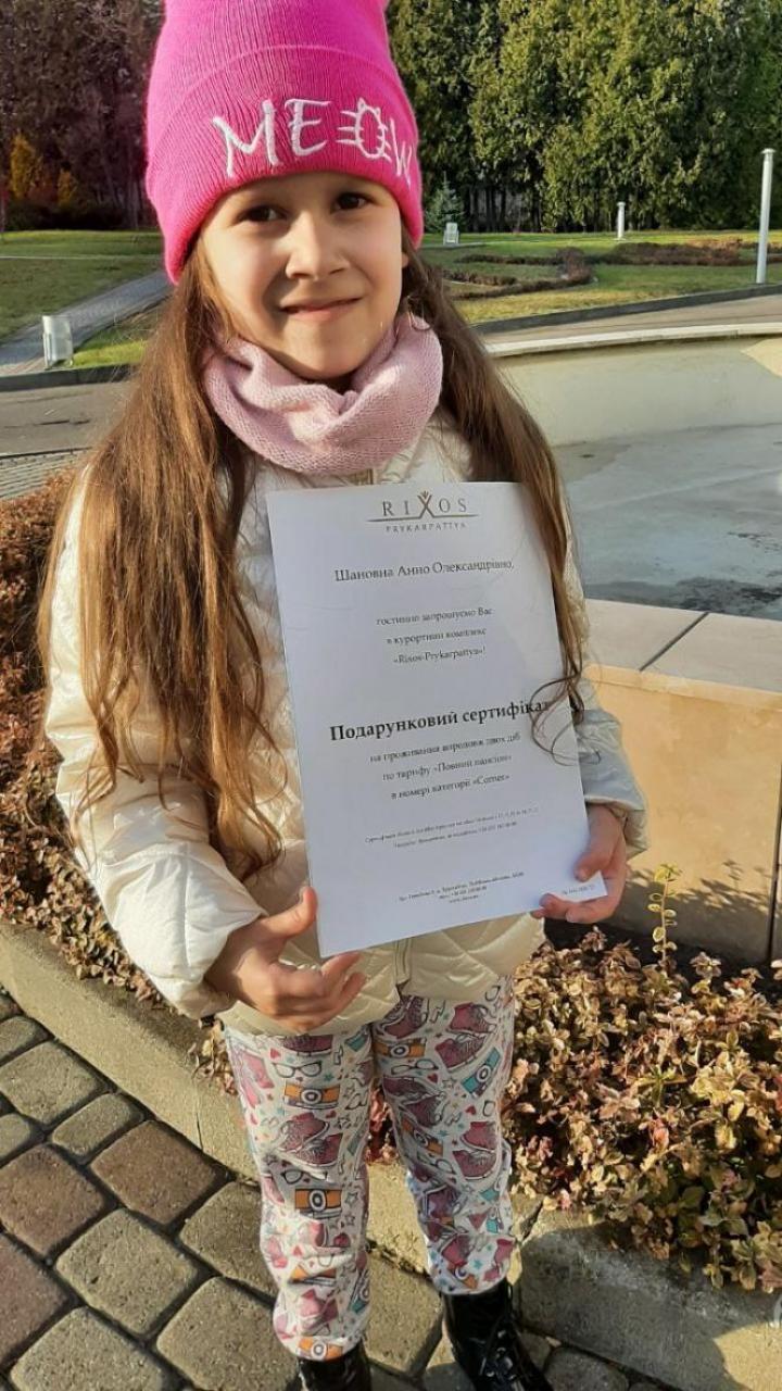 Нещодавно юна козятинчанка перемогла у ще одному конкурсі, який оголосила одна з найбільших в Україні мереж автозаправних станцій. Переможців обирали шляхом голосування, яке проходило онлайн. За умовами конкурсу, три дитячих малюнки, які набрали найбільше вподобань, потраплять на кавові стаканчики, які продаватимуть у кафе і на автозаправних станціях по всій країні, а діти з батьками отримають сертифікат на триденний відпочинок в Прикарпатті.