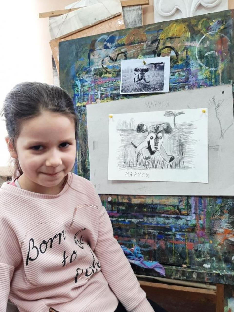 Удома у Марусі — рай для справжнього художника. Цілі ящики олівців та фарб — і акварель, і гуаш, і акрил. Залишилося опанувати лише олію. Вона пробує різні техніки. Мама просто у захваті від її пейзажів, а Маруся останнім часом захопилася штрихуванням — це коли зображення створюється простим олівцем, а об’єм, тіні і тони передаються за рахунок зміни нахилу штрихів та натиску на грифель. Одна з таких робіт, де зображений песик, що біжить, теж висить на стіні у мами на роботі.