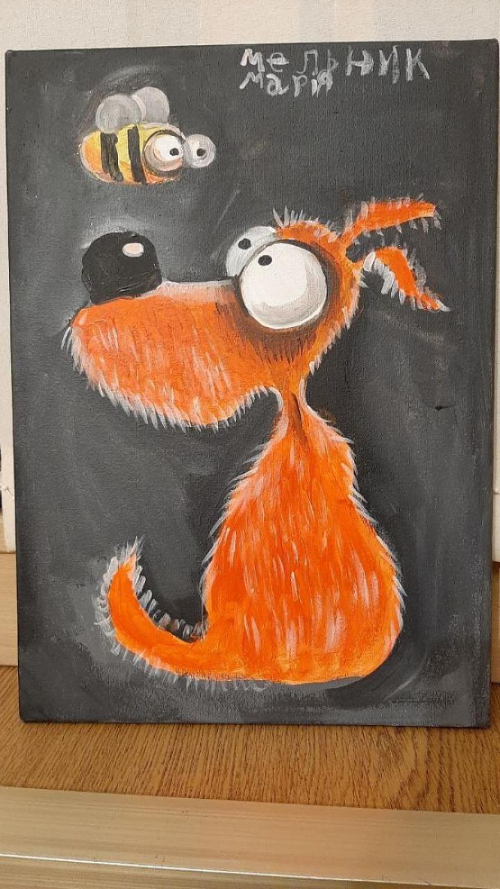 — Що стосується цього песика, — показує Анна одну з робіт. — У мене один із клієнтів, не знаю, хто він за професією, спитав, скільки років дитині було, коли вона це намалювала? Він сказав: «Діти таких очей не малюють. Діти не розуміють, що очі несуть в собі інформацію».