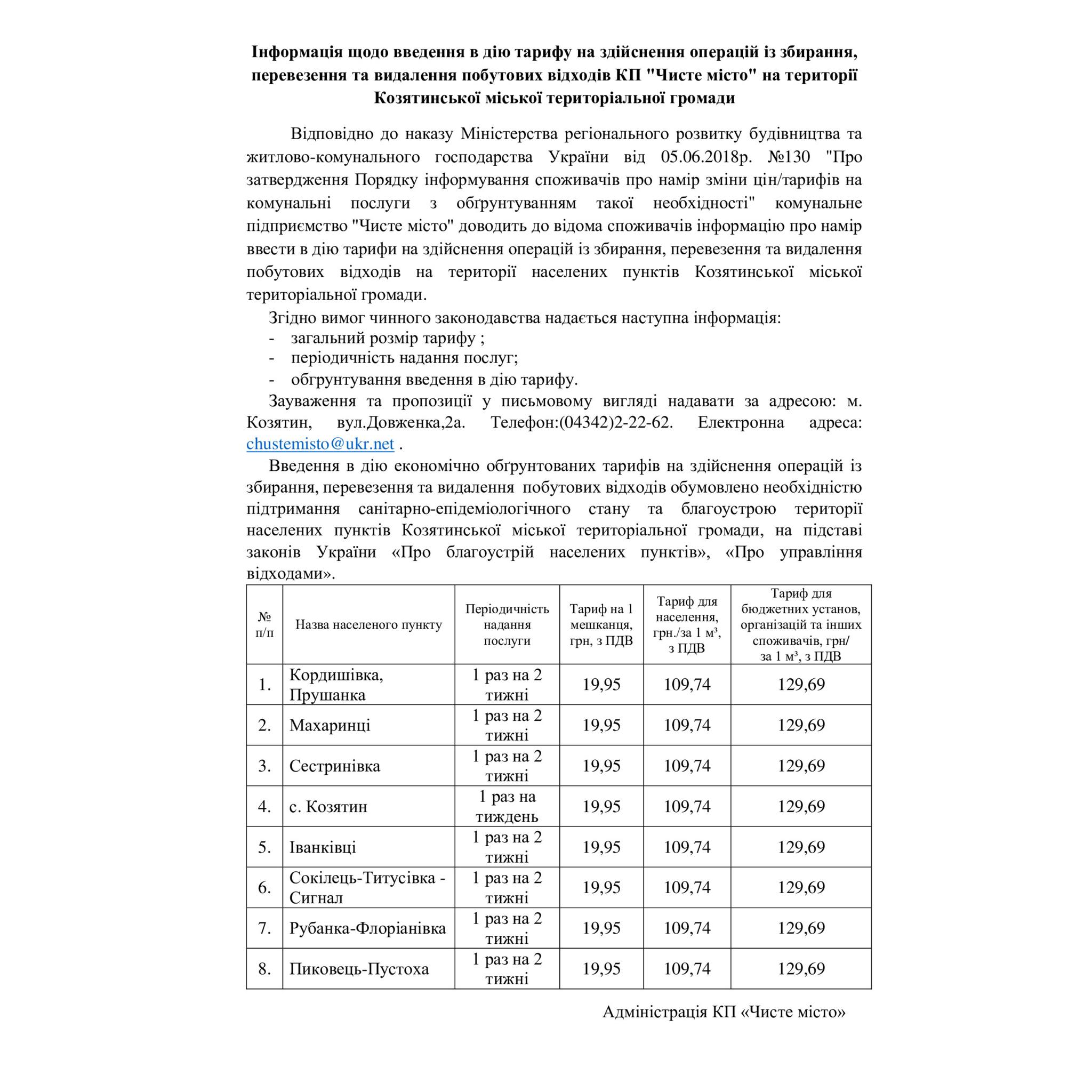 - Для старостинських округів Козятинської міської територіальної громади мають намір підняти плату за вивіз сміття. Наразі селяни сплачують за це від 10,58 до 16, 60 гривень, залежно від кількості жителів на місяць.