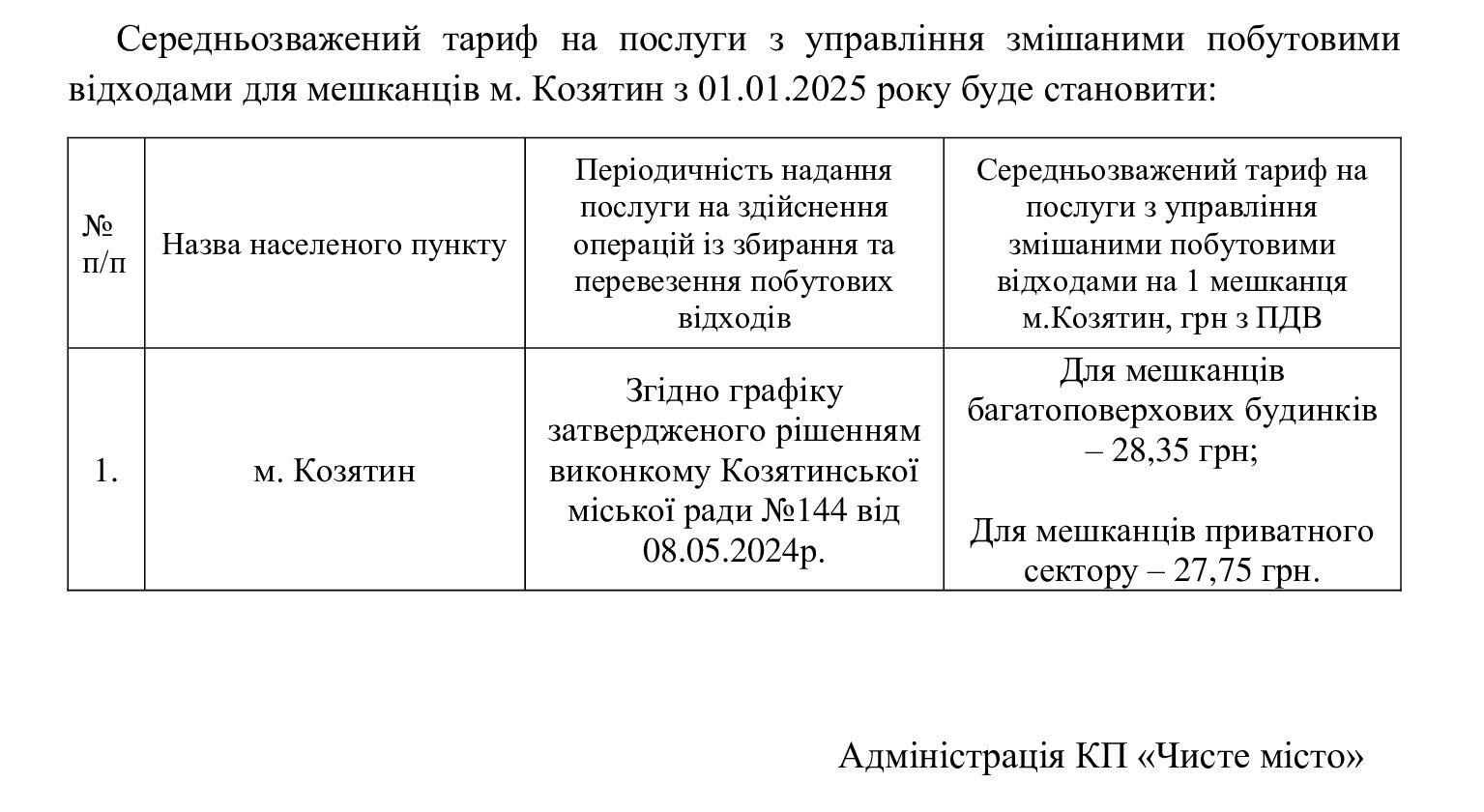 - На сторінці Козятинської міської ради опублікували інформацію щодо внесення змін до середньозваженого тарифу на послуги з управління змішаними побутовими відходами Комунальним підприємством «Чисте місто» на території міста Козятин Козятинської міської територіальної громади