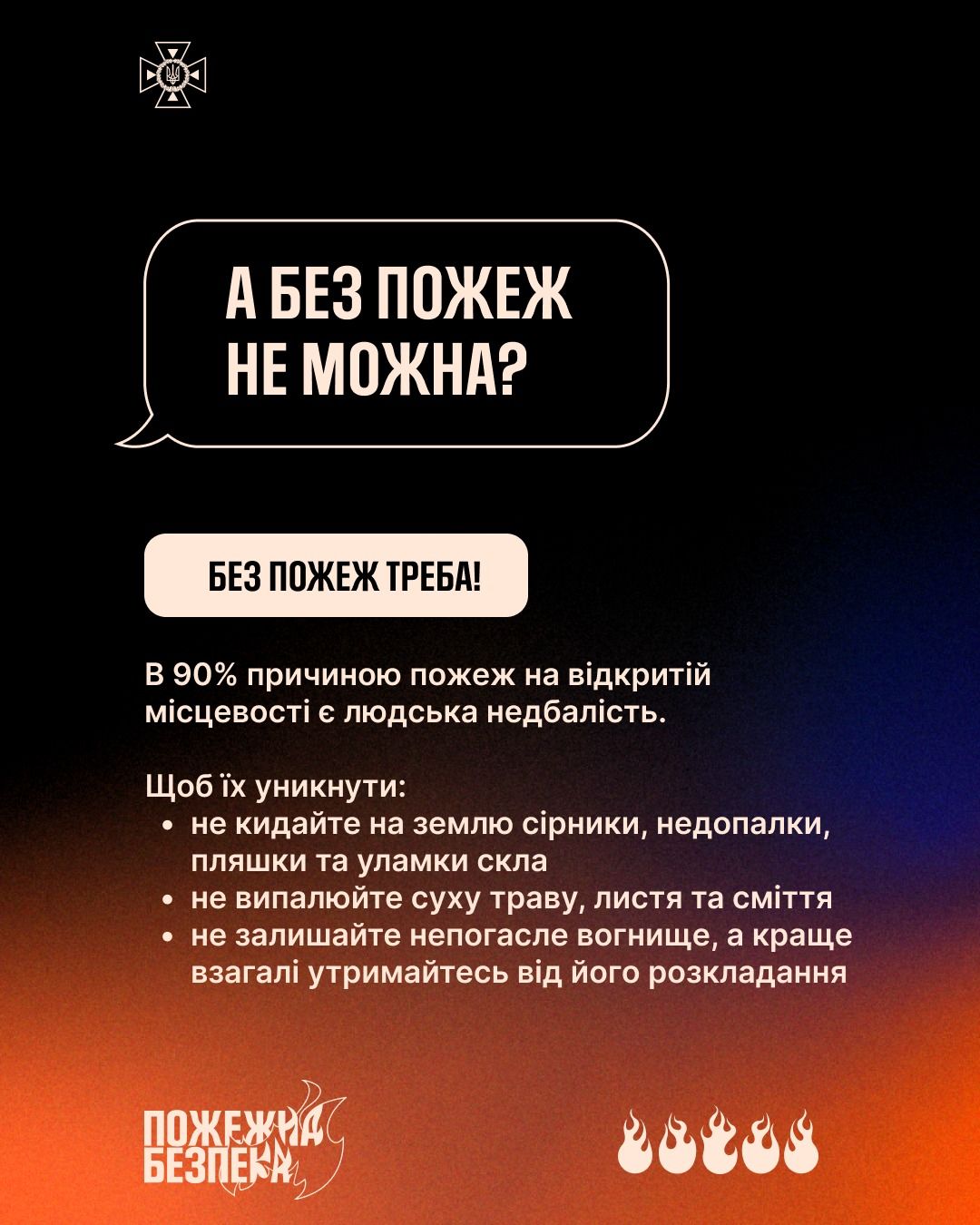 — Отже, шановні громадяни вкотре звертаємось до вас, не провокуйте пожежі в природних екосистемах та не завдавайте шкоди довкіллю та своєму гаманцю. Щоб попередити пожежі в природних екосистемах необхідно пам’ятати, що забороняється спалювати суху рослинність та післяжнивні залишки, розводити багаття дозволяється лише в безвітряну погоду під постійним наглядом і на відстані не менше 15 м. від будівель та споруд.