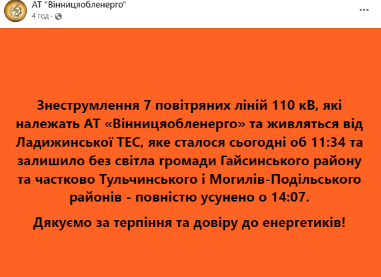 — Ця аварія не пов’язана із ворожими атаками. Тому просимо не сіяти паніку, — йдеться на сторінці Вінницяобленерго. — Енергетики АТ Вінницяобленерго, Ладижинської ТЕС ДТЕК та Південно –Західного РДЦ докладають максимум зусиль аби електропостачання у найшвидші терміни було відновлено. Дякуємо за терпіння та розуміння.