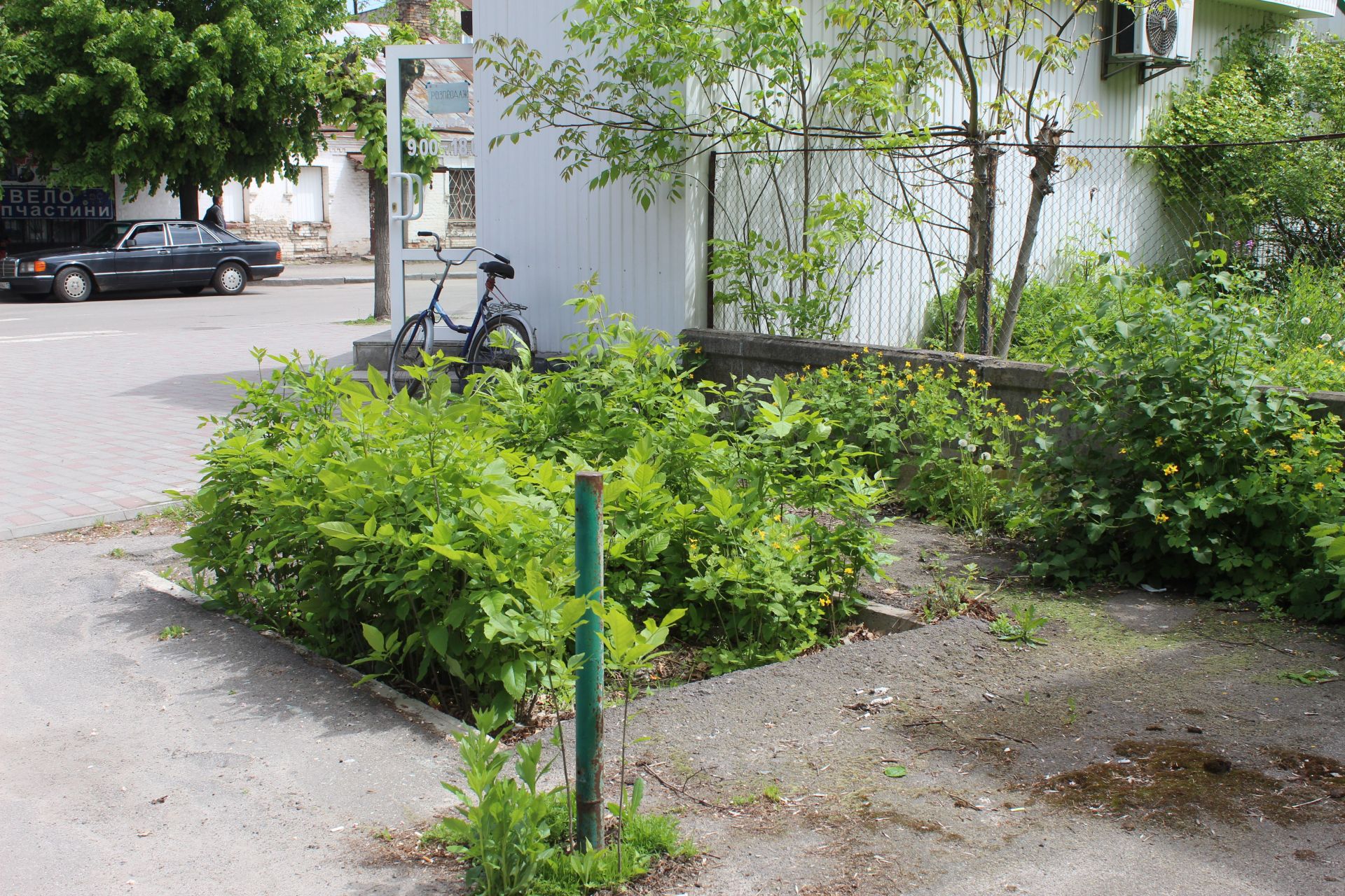 А на місці кіоску росли самосії дерев. Біля паркана – кропива, чистотіл, кульбаба та пирій.