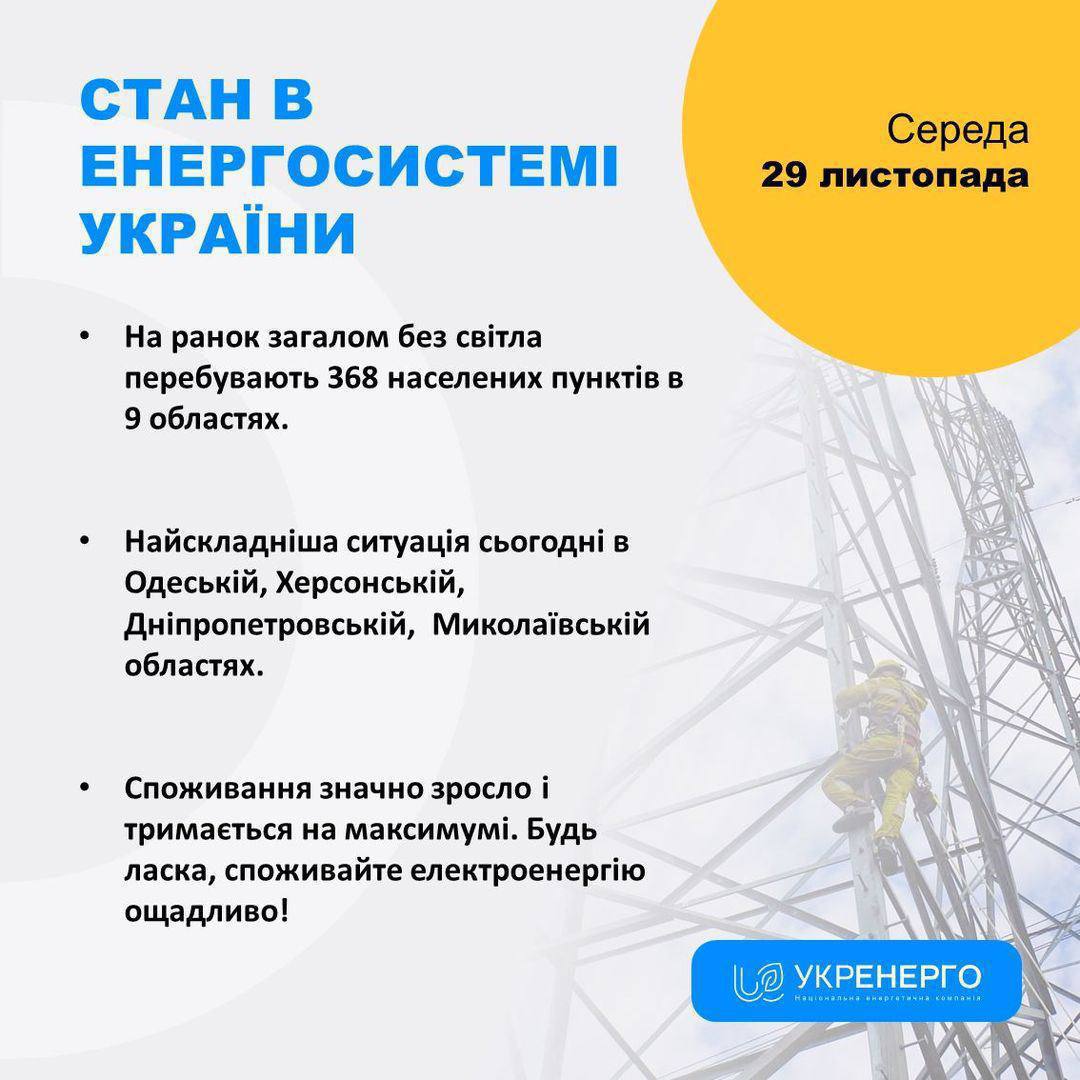 За інформацією Міненерго, через негоду та бойові дії станом на ранок 29 листопада в Україні без світла 812 населених пункти. Зокрема, на Вінниччині через технічні причини знеструмлено повітряні лінії.