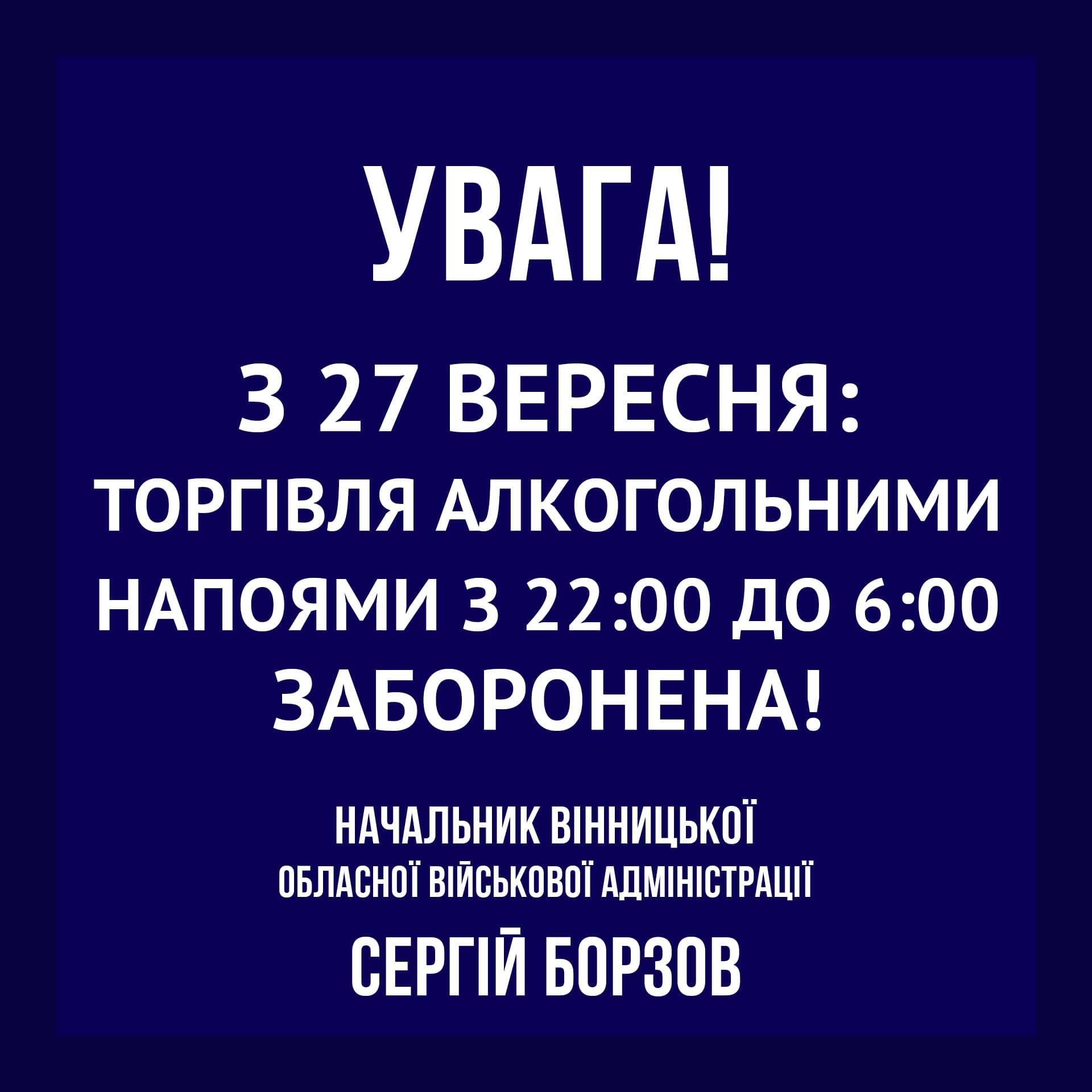 - Голова Вінницької ОВА Сергій Борзов підписав наказ про заборону продажу алкоголю з 22:00 до 06:00 на території Вінницької області.