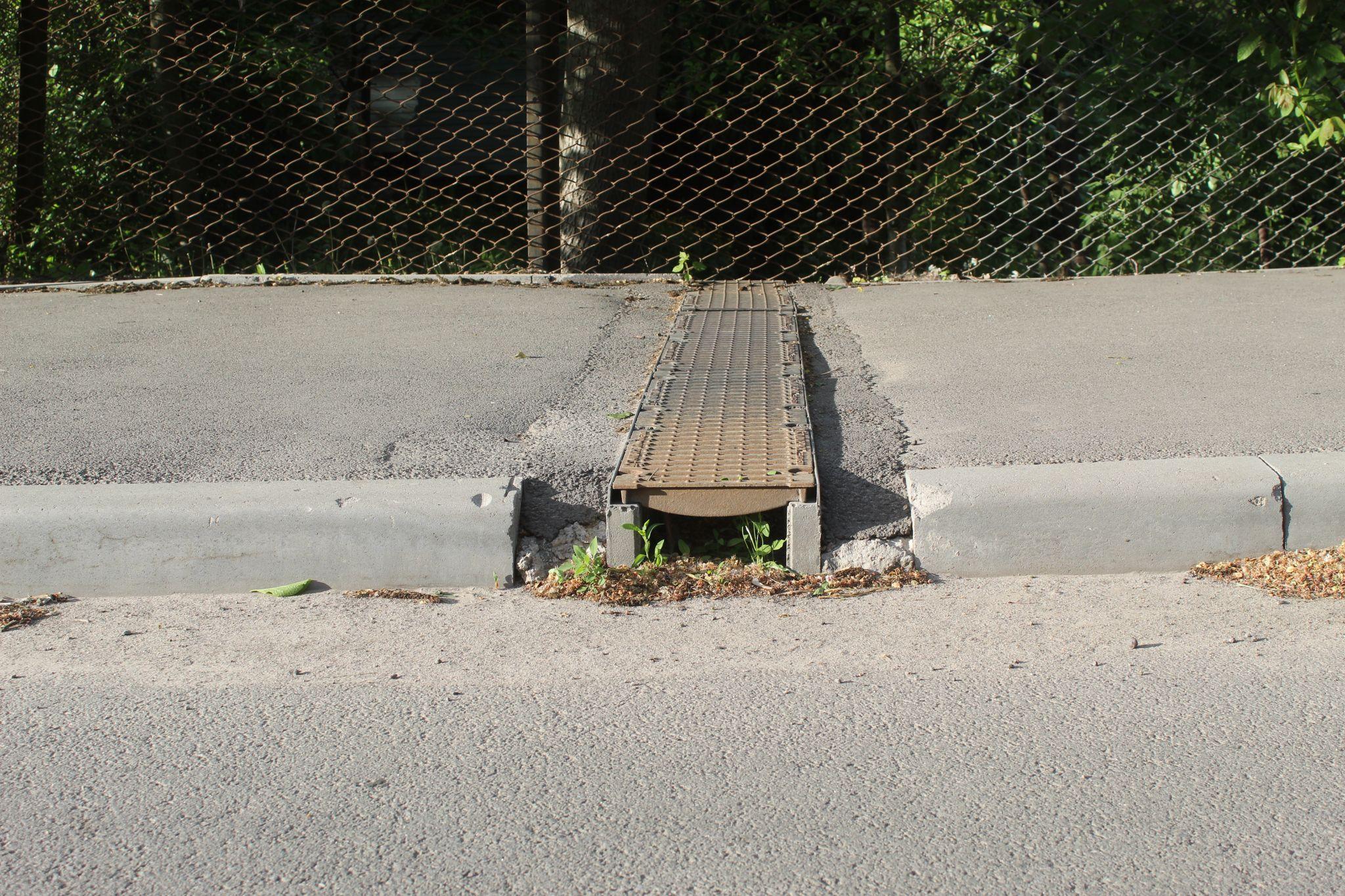 На вулиці Куликівського з водостоком трохи інша ситуація. Там стічний канал у сусідстві з сіткою домоволодіння. Біля сітки стічний канал забитий повністю, а від тротуару ще є в чому травичці рости.