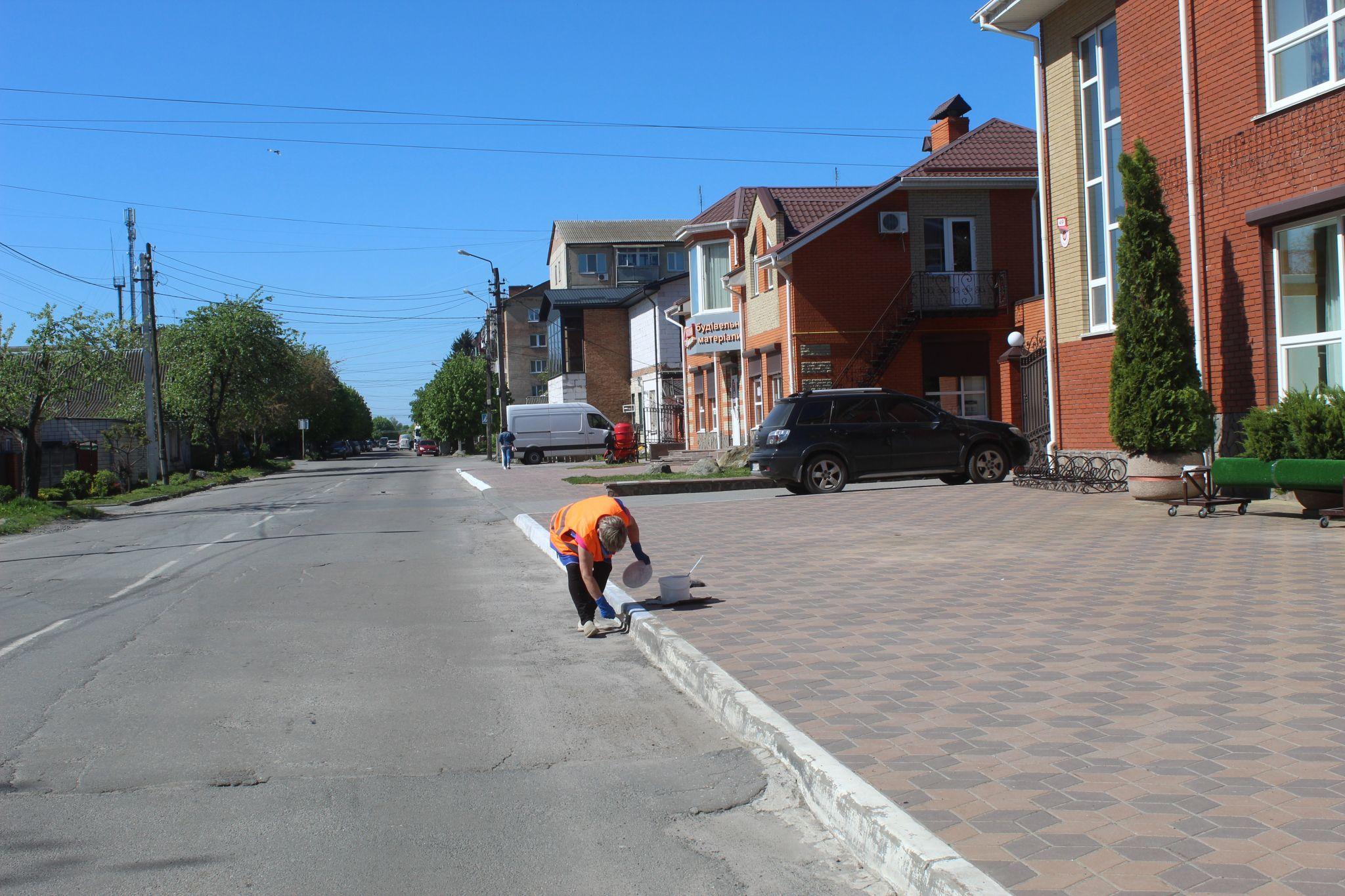 Останнє фото ми зробили на вулиці Героїв Майдану. Там працівниця комунальної служби білила бордюри, а щоб був гарний результат, то вона постійно підмітала пелюстки опалого цвіту.