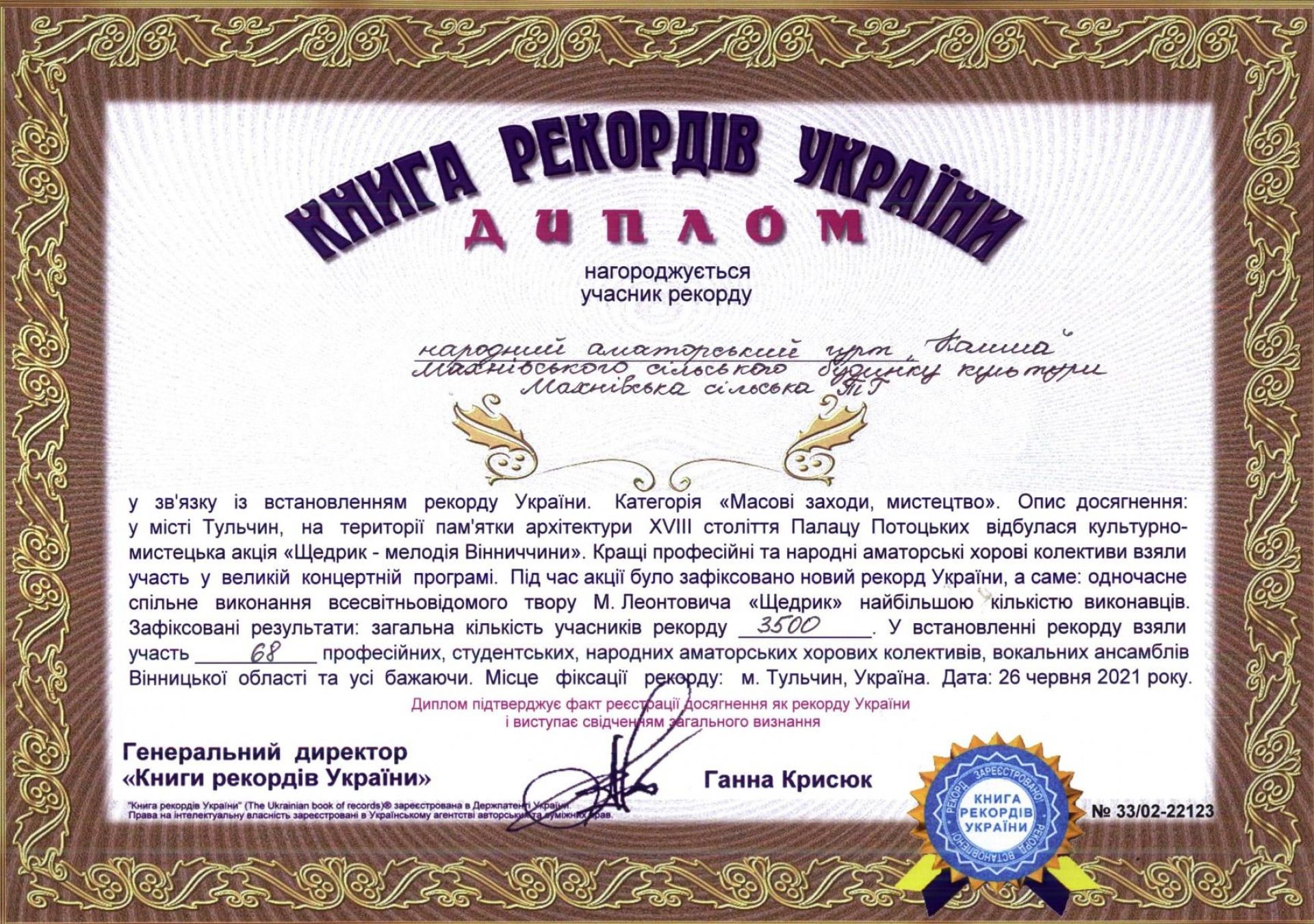 В суботу, 26 червня в місті Тульчин Вінницької області встановили новий рекорд України. 3 тисячі 512 учасників з 68 вокально-хореографічних колективів утворили зведений хор та виконали всесвітньо відомий музичний твір Миколи Леонтовича «Щедрик».
