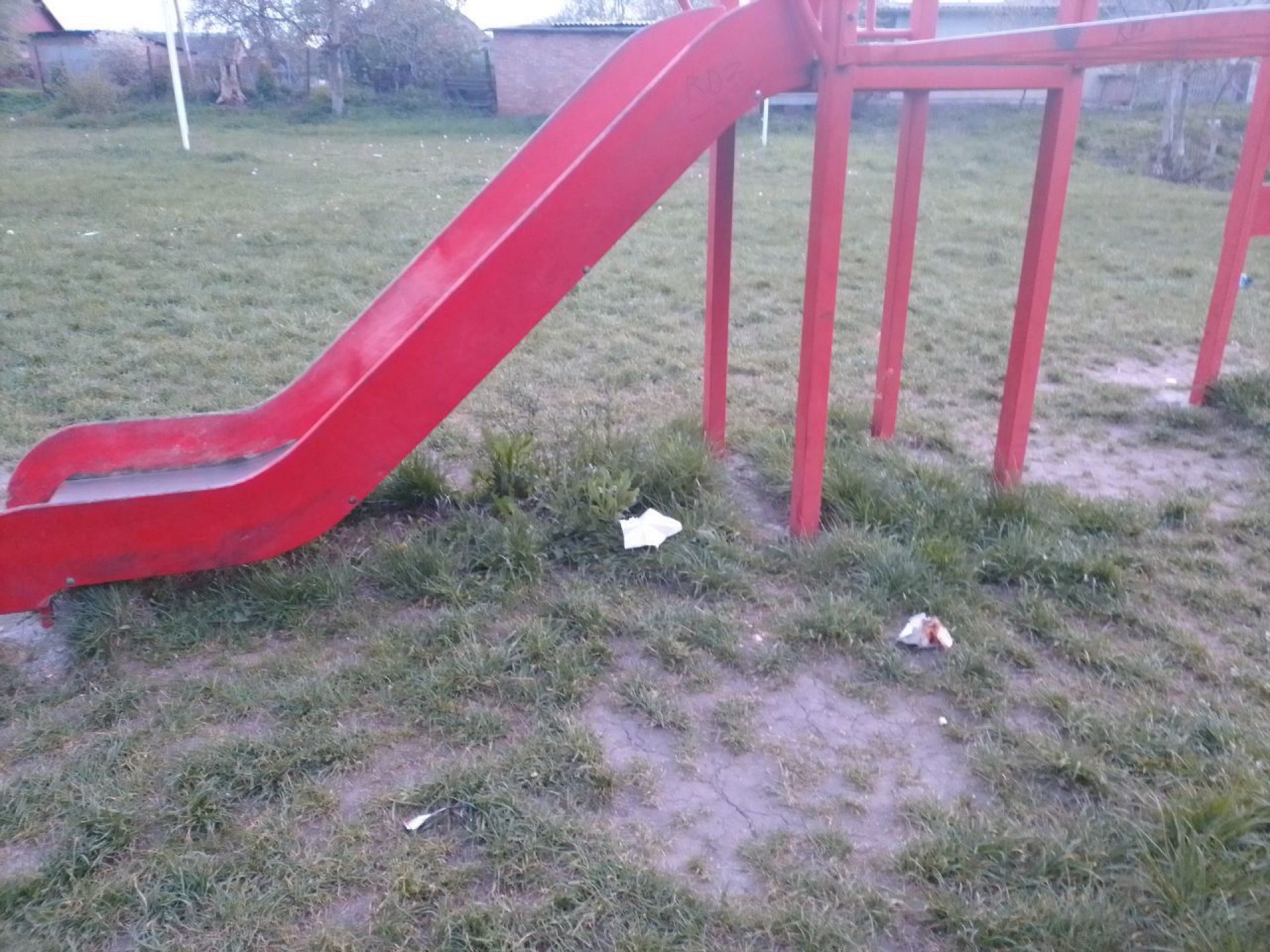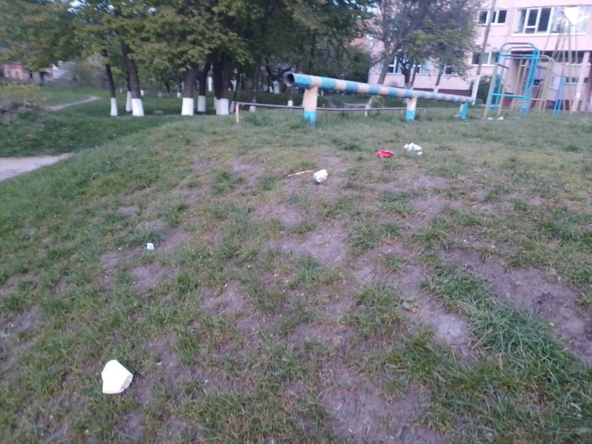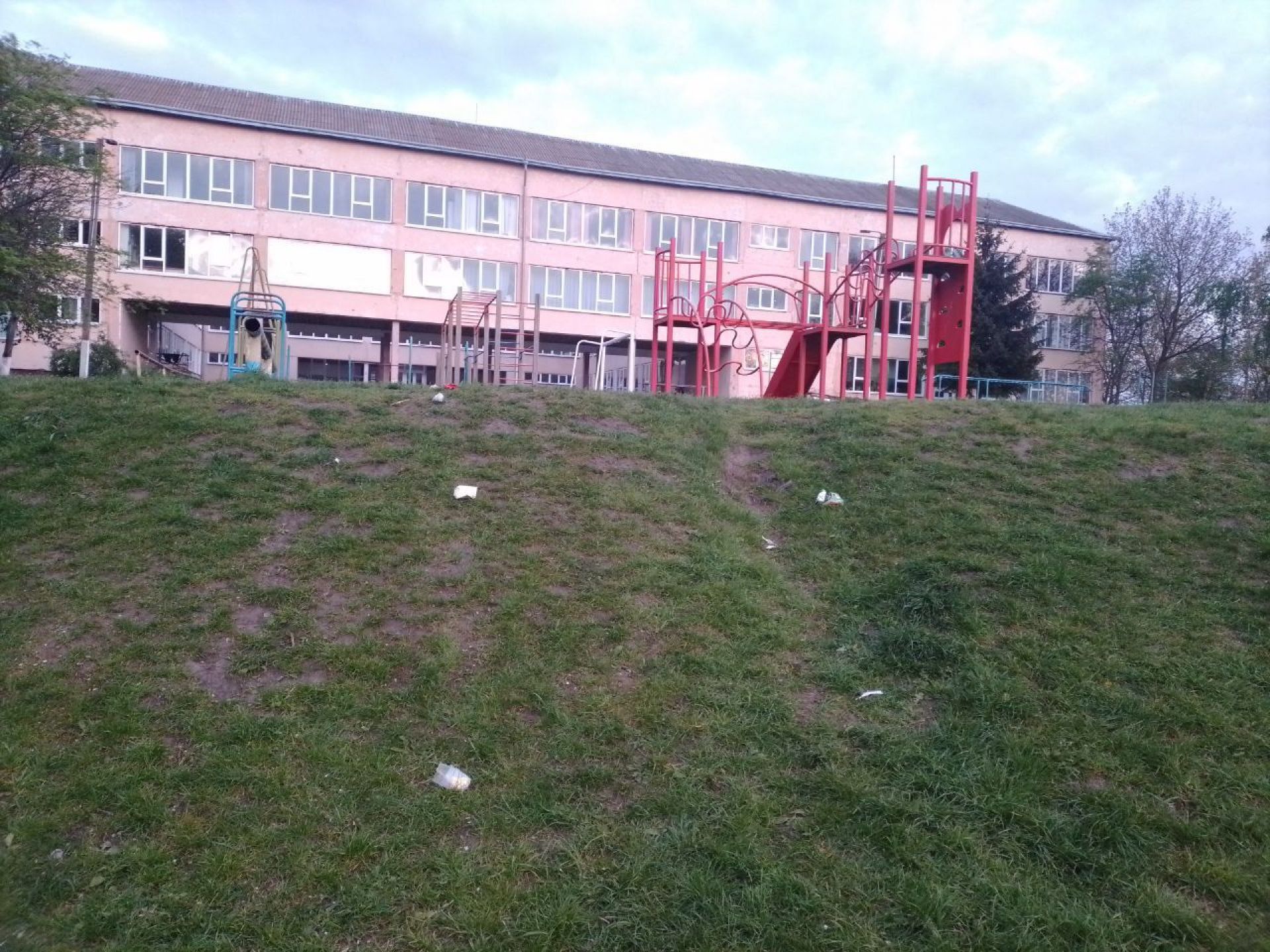Повно сміття — таку картину ми застали на майданчику четвертої школи надвечір у вівторок, 9 травня. Обгортки, пакети та пляшки порозносило вітром по всій території, бо сміття валялося і біля гірки, і біля турніків, і на зеленій зоні.