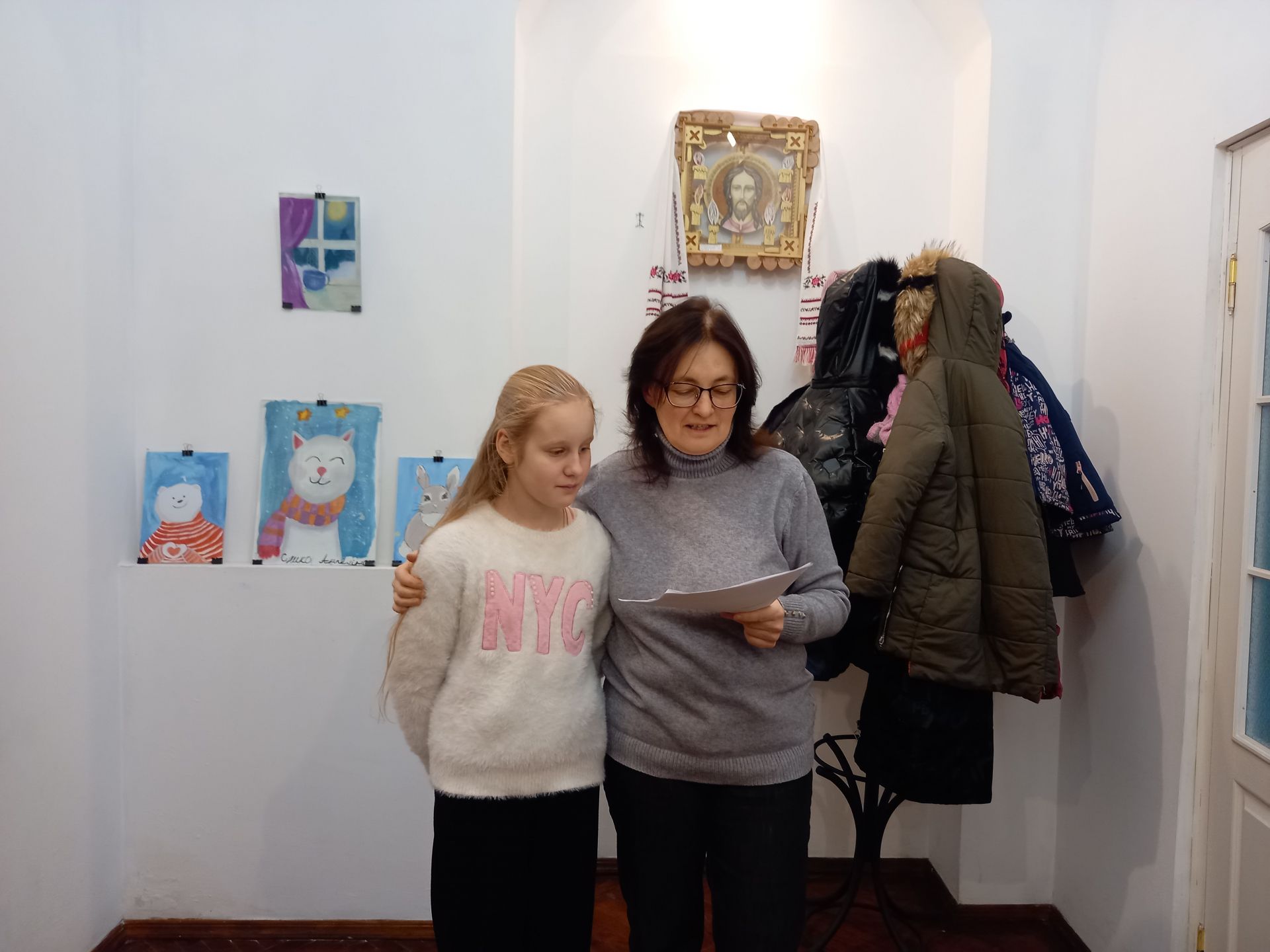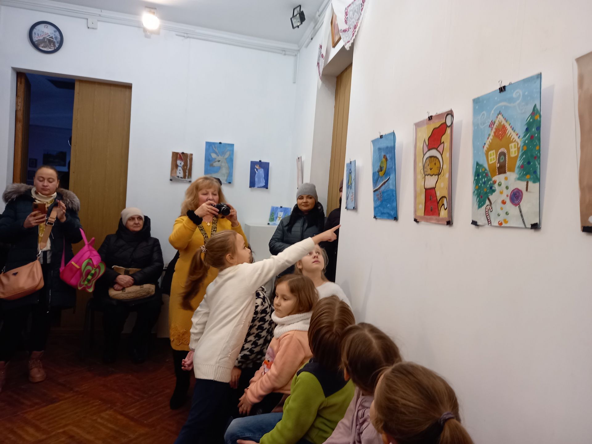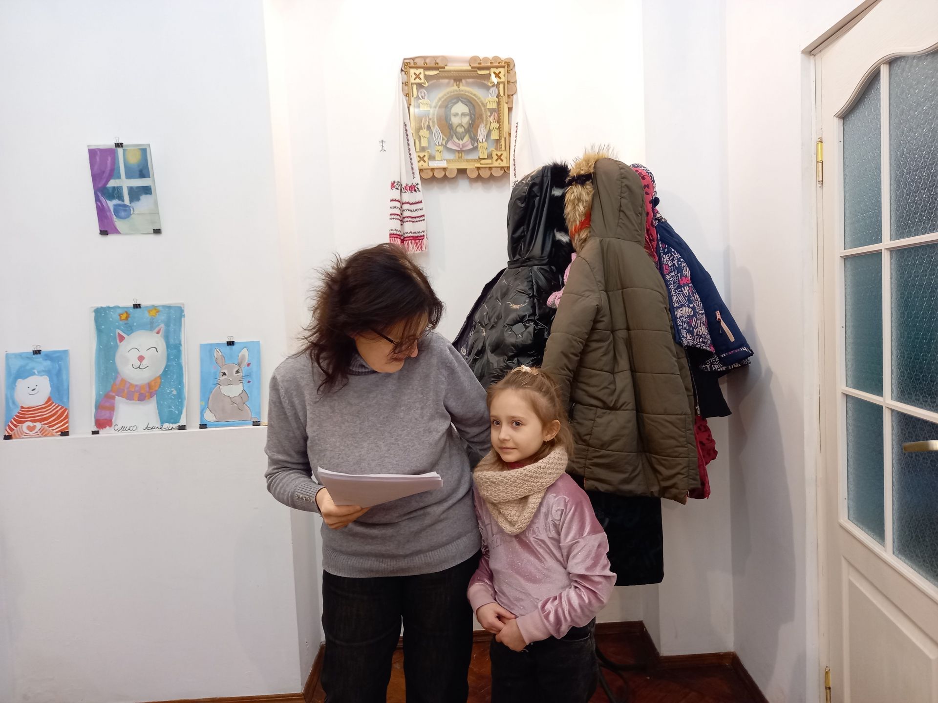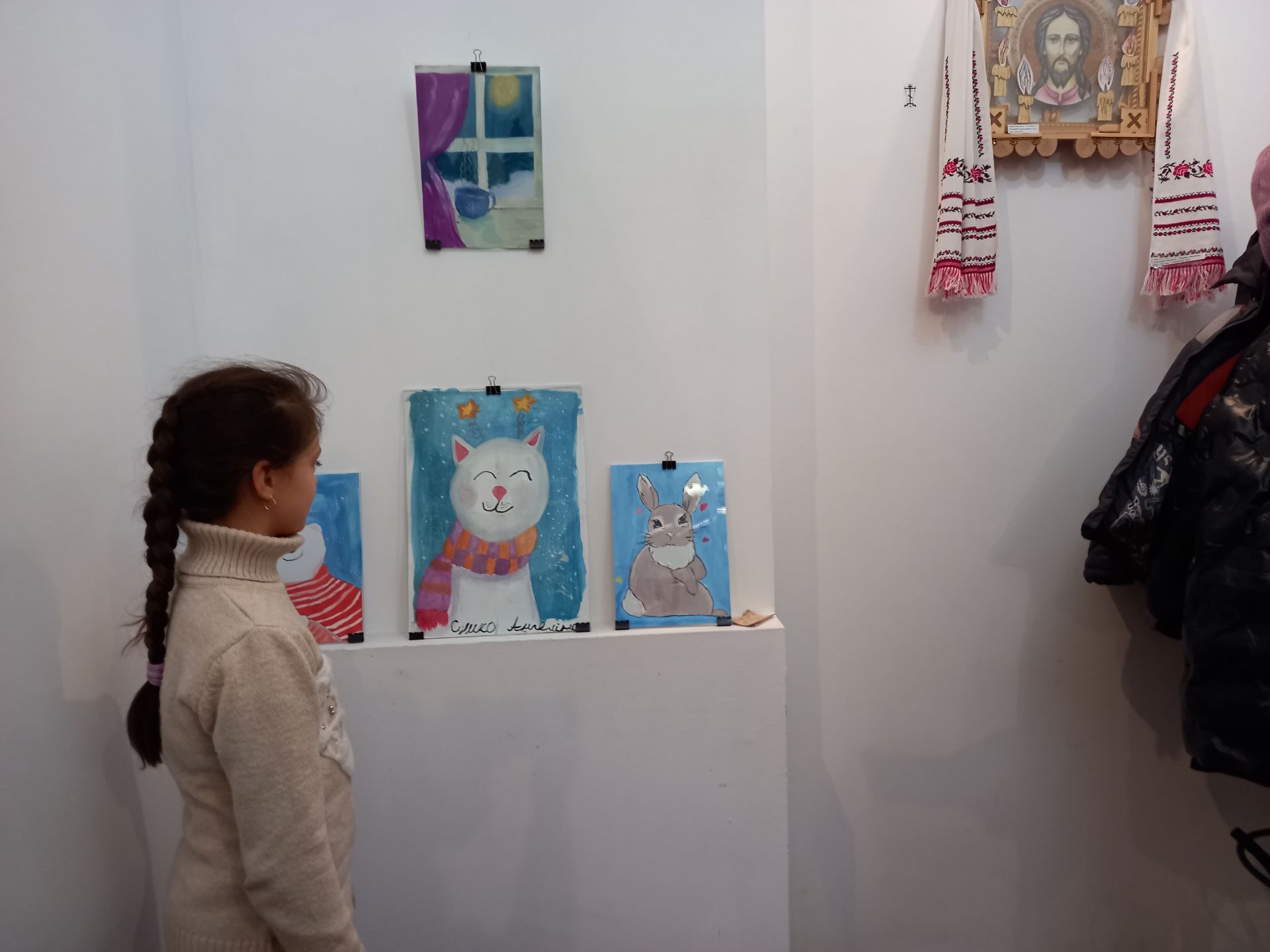До виставки долучили також роботи дітей, які брали участь у майстер-класі, що відбувся під час зимових канікул. Усі вони — вихованці гуртка «Сувенір», що діє при Центрі дитячої та юнацької творчості. Серед них Ліза Добриніна. Вона вивчає англійську, малює та багато читає. Ще одна учасниця — Евеліна Гнатюк. Дівчинка захоплюється малюванням, музикою та гімнастикою. Коли виросте, мріє стати дизайнером інтер’єрів. Також серед робіт малюнок Ангеліни Сушко. Окрім малювання, дівчинка також співає та грає в шахи.