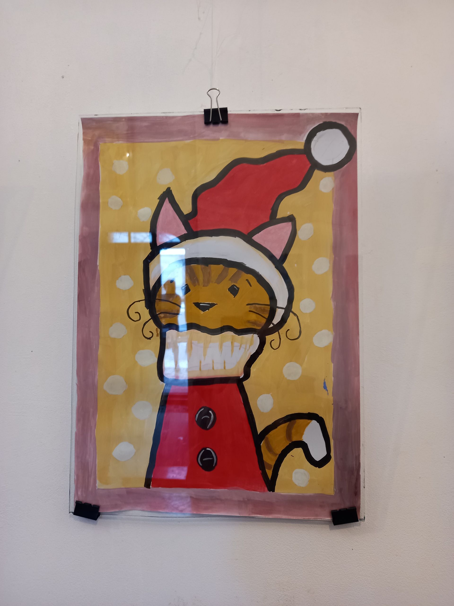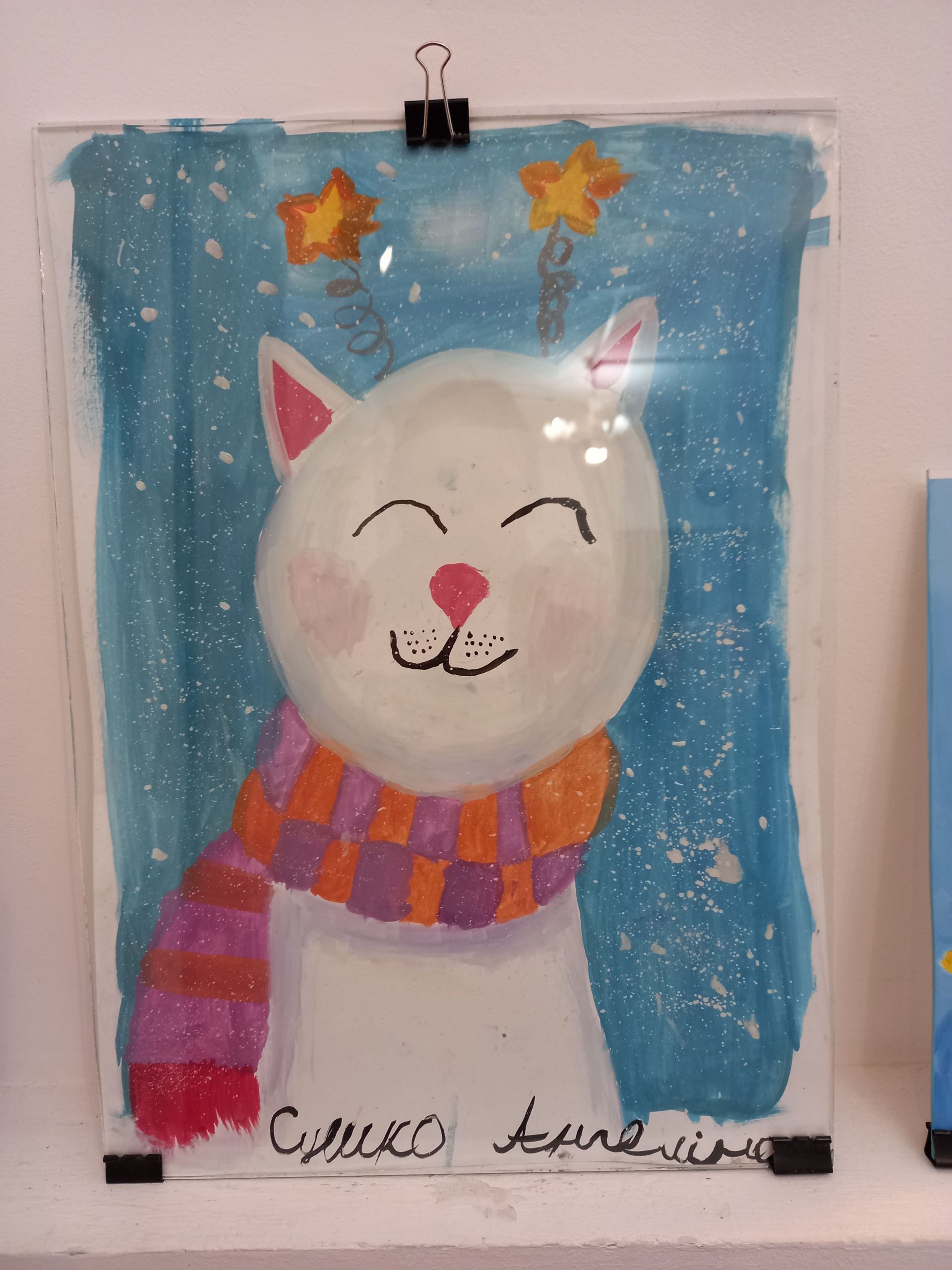 Учениця 1-А класу опорного ліцею Маргарита Мартовицька теж мріє стати видатною художницею. Хоча в родині у дівчинки ніхто не малював. До виставки підготувала роботу, яку назвала «Друзі». Це снігурчик, який сидить поруч із котиком.