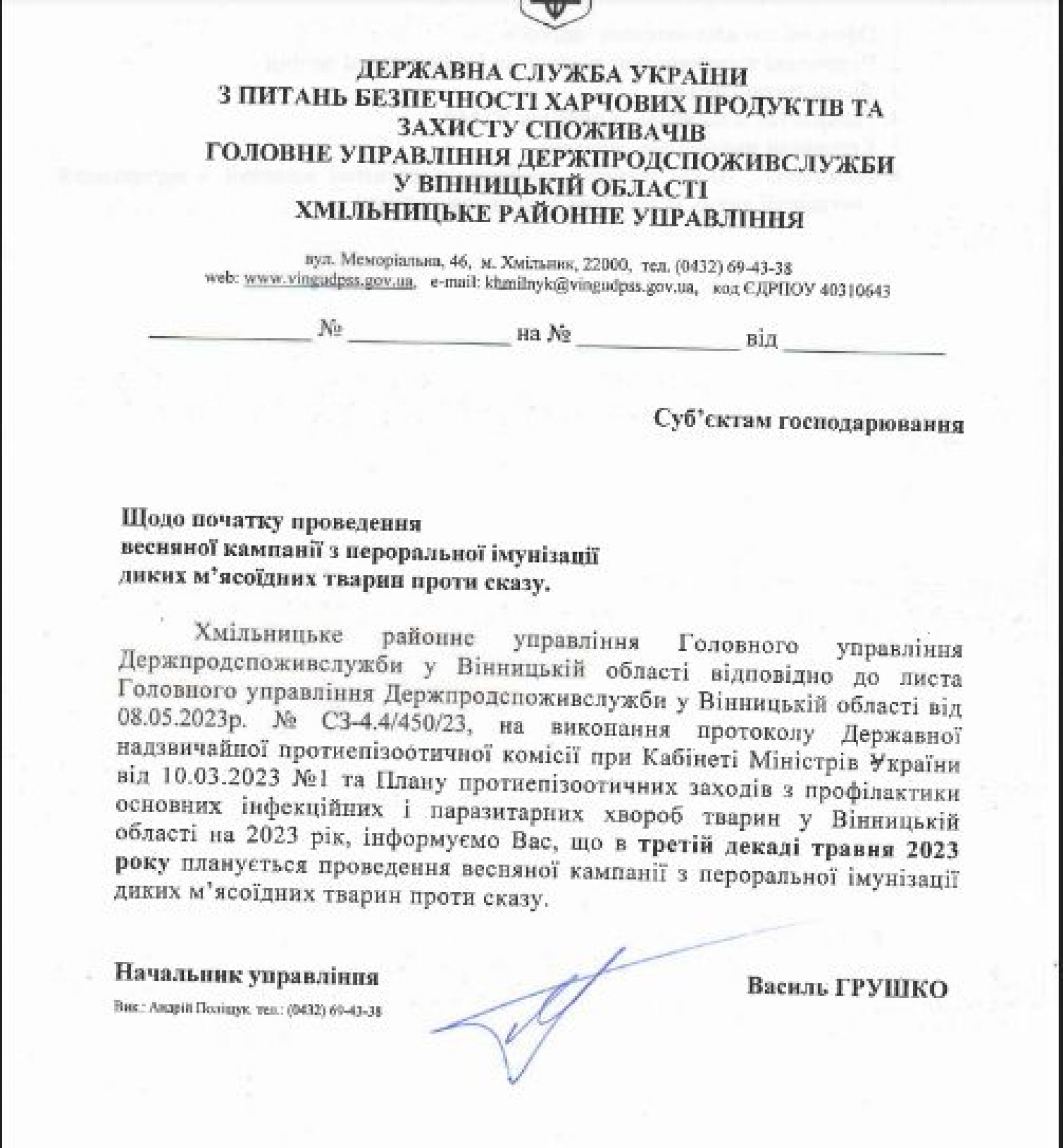 На території Вінницької області протягом третьої декади травня 2023 року проводитиметься весняна кампанія з пероральної імунізації диких м'ясоїдних тварин проти сказу (відповідно до Плану протиепізоотичних заходів з профілактики основних інфекційних і паразитарних хвороб тварин в області на 2023 рік).