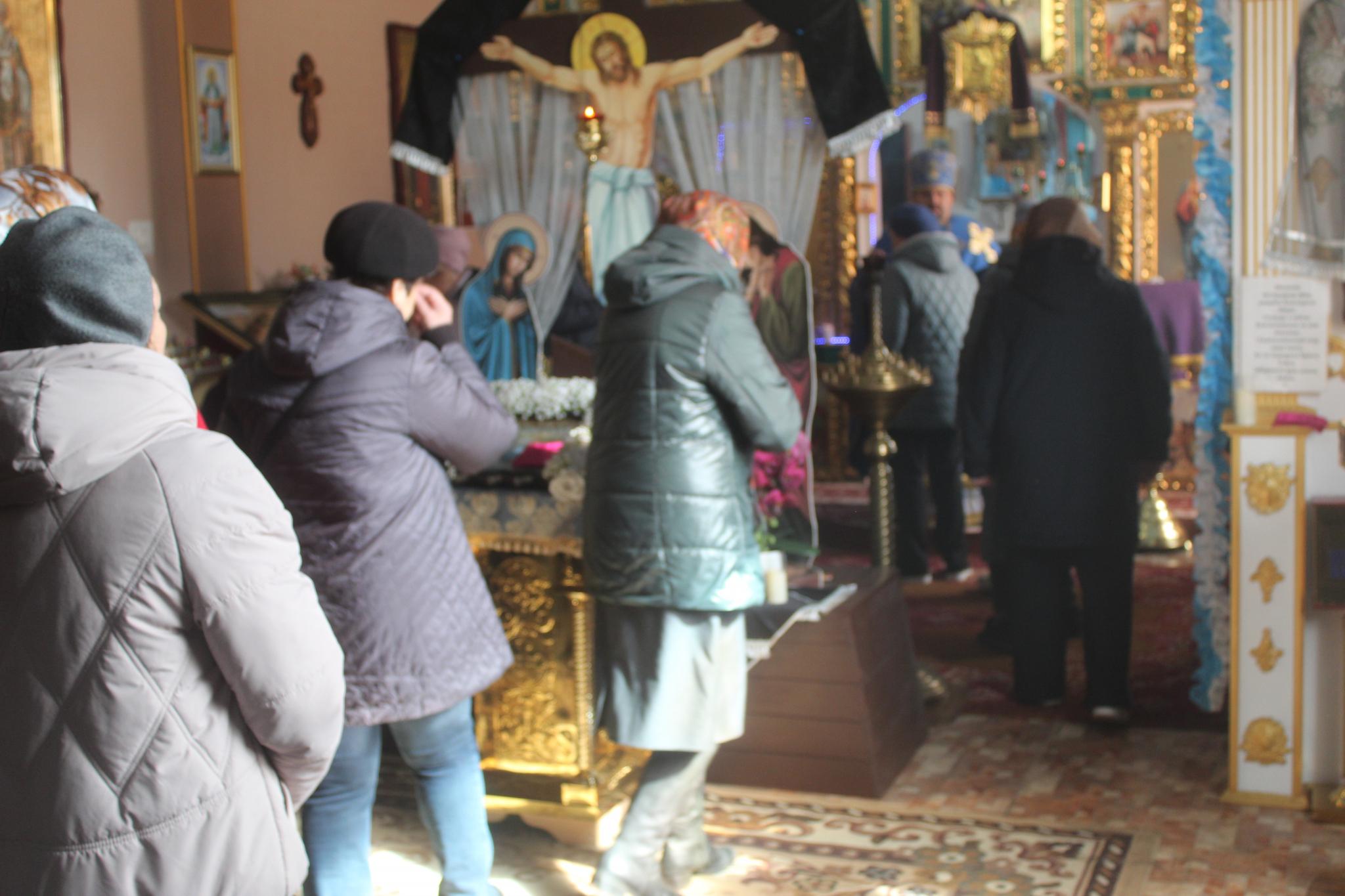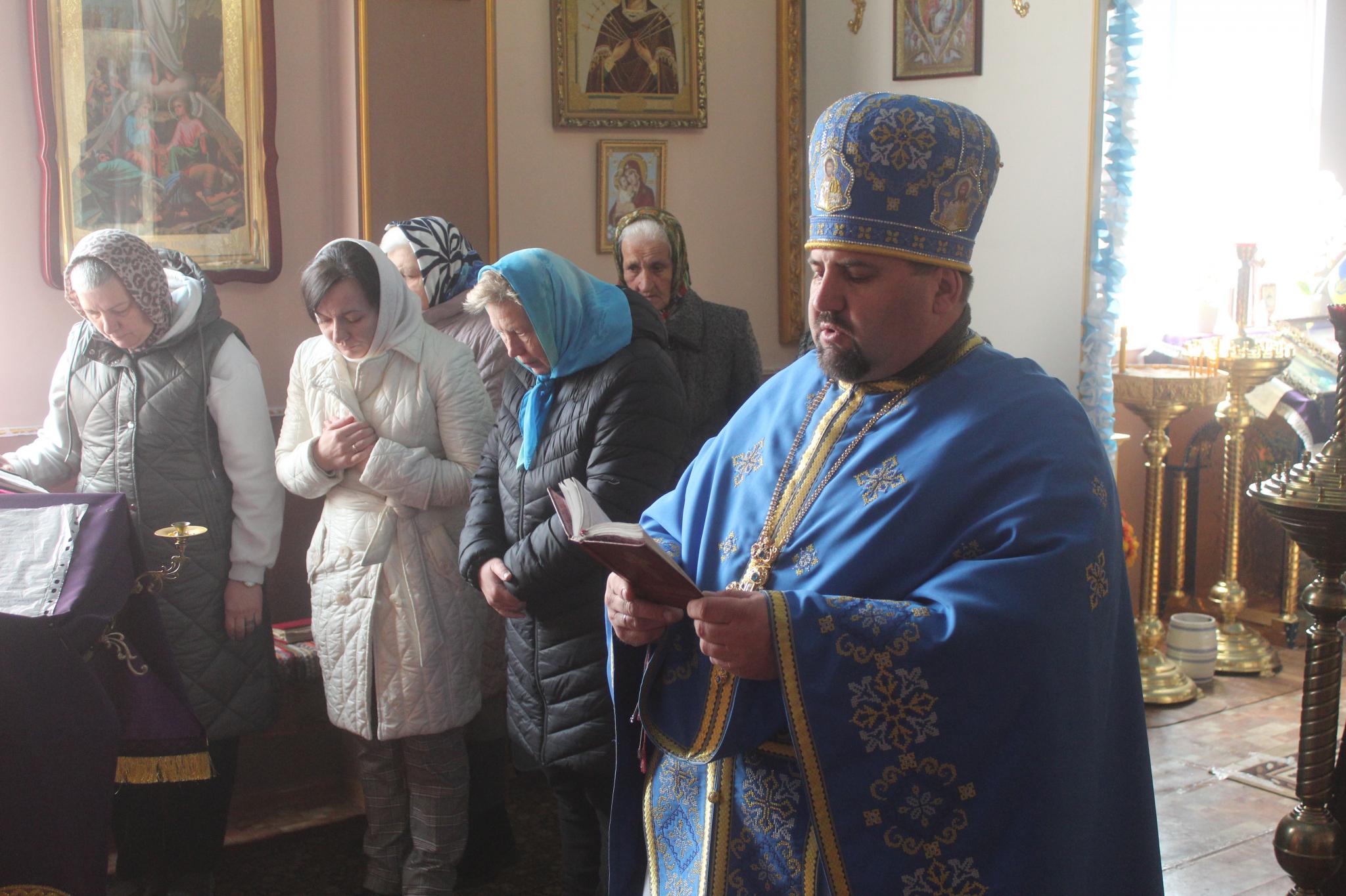 На початок святкової літургії ми трохи запізнилися. Вірян в центральній частині храму було чимало, в середній частині церкви біля вікна розмістився церковний хор, а на престолі біля вівтаря отець Василь в блакитних ризах просив у Бога Божої благодаті, зміцнення віри, прощення гріхів та заступництва Діви Марії для захисту наших воїнів, щоб вони повернулися додому всі живими і неушкодженими, захисту народу України та вигнання ворога з нашої землі. У молитвах звучало прохання про мир, здоров’я, розуміння Божої волі та його духовну силу.