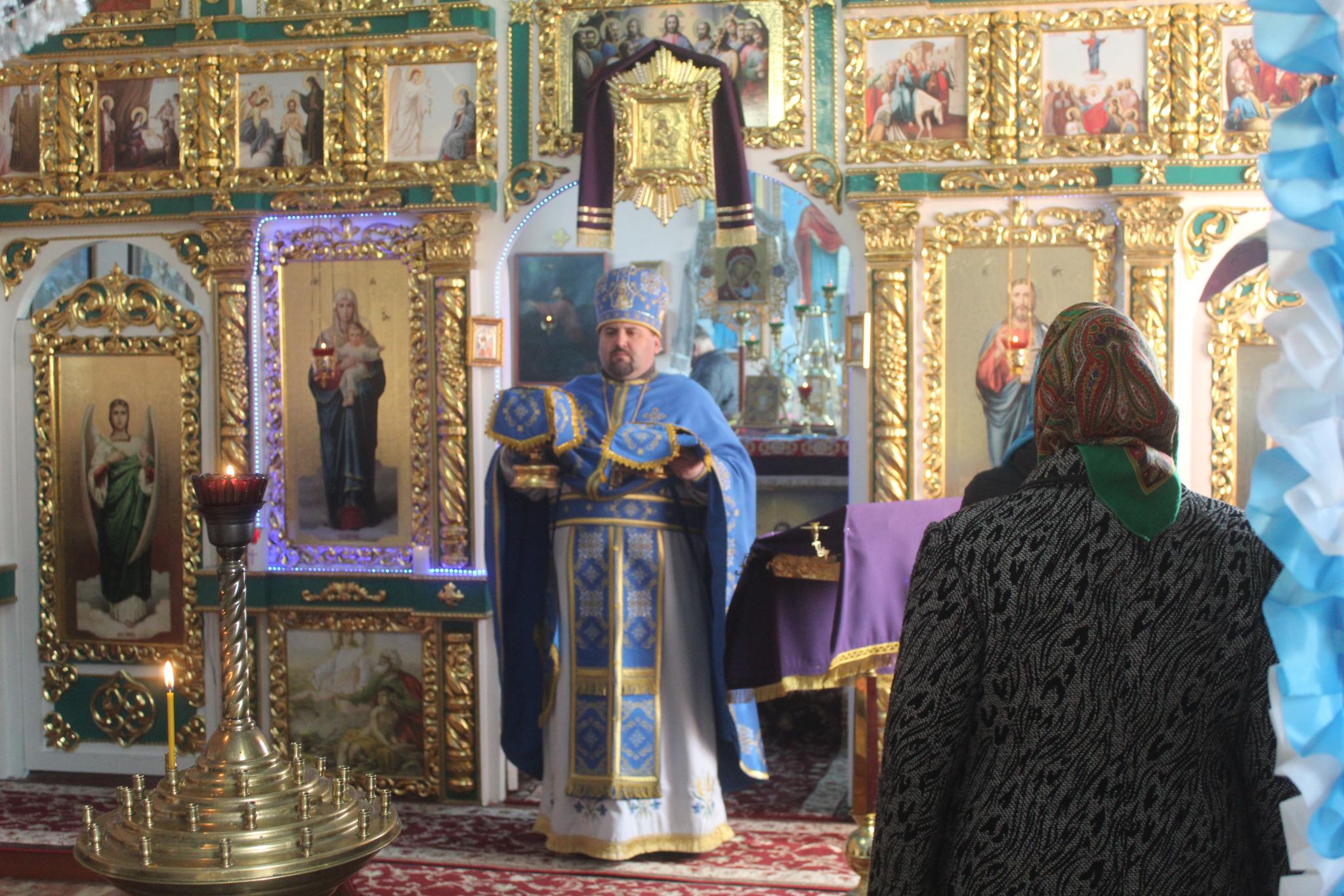 Як пояснили прихожани храму блакитні ризи священника в православній традиції символізують небесну чистоту, непорочність та особливу честь, присвячену Пресвятій Богородиці. Богослужіння було наповнене урочистими піснеспівами та декілька разів звучав вітальний вигук «Радуйся». Під кінець служби Божої священник вийшов до прихожан і прочитав уривок із Євангелія.