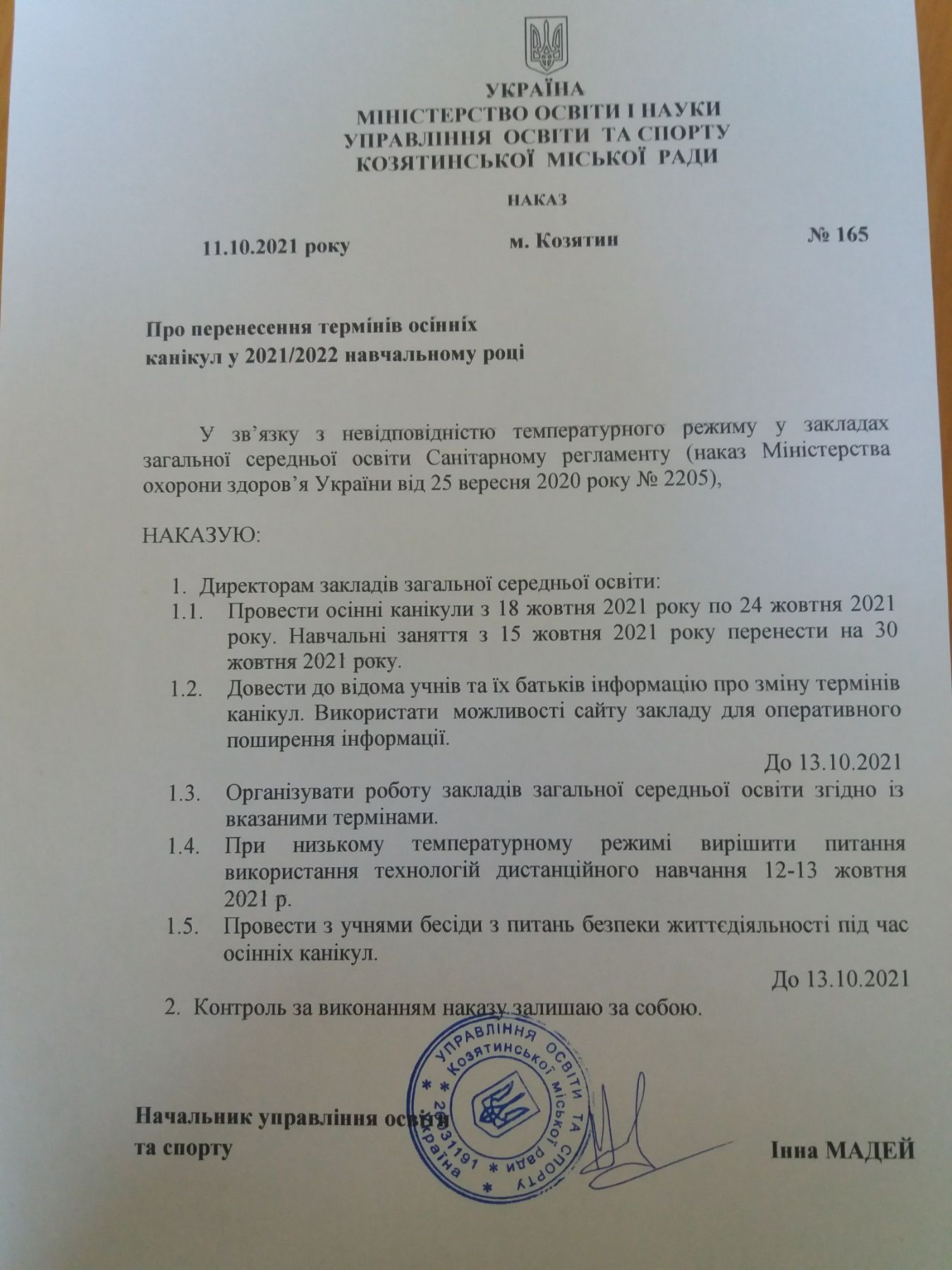 У зв’язку з невідповідністю температурного режиму у закладах загальної середньої освіти Санітарному регламенту (наказ Міністерства охорони здоров’я України від 25 вересня 2020 року № 2205), начальник управління освіти та спорту Інна Мадей підписала наказ про початок осінніх канікул у закладах середньої освіти Козятинської територіальної громади на тиждень раніше – з 18 по 24 жовтня, а навчальні заняття з 15 жовтня перенести на 30 жовтня