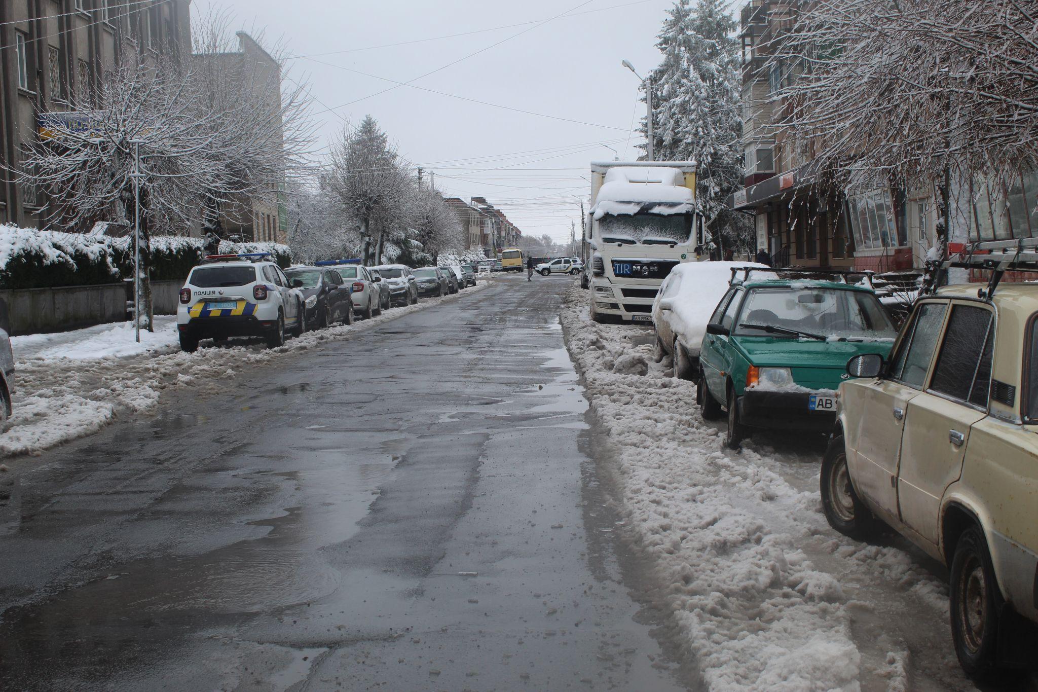 На вулиці Івана Франка дорога від снігу чиста. Лише на перехрестях з другорядними вулицями люди потрапили у пастку снігової каші.