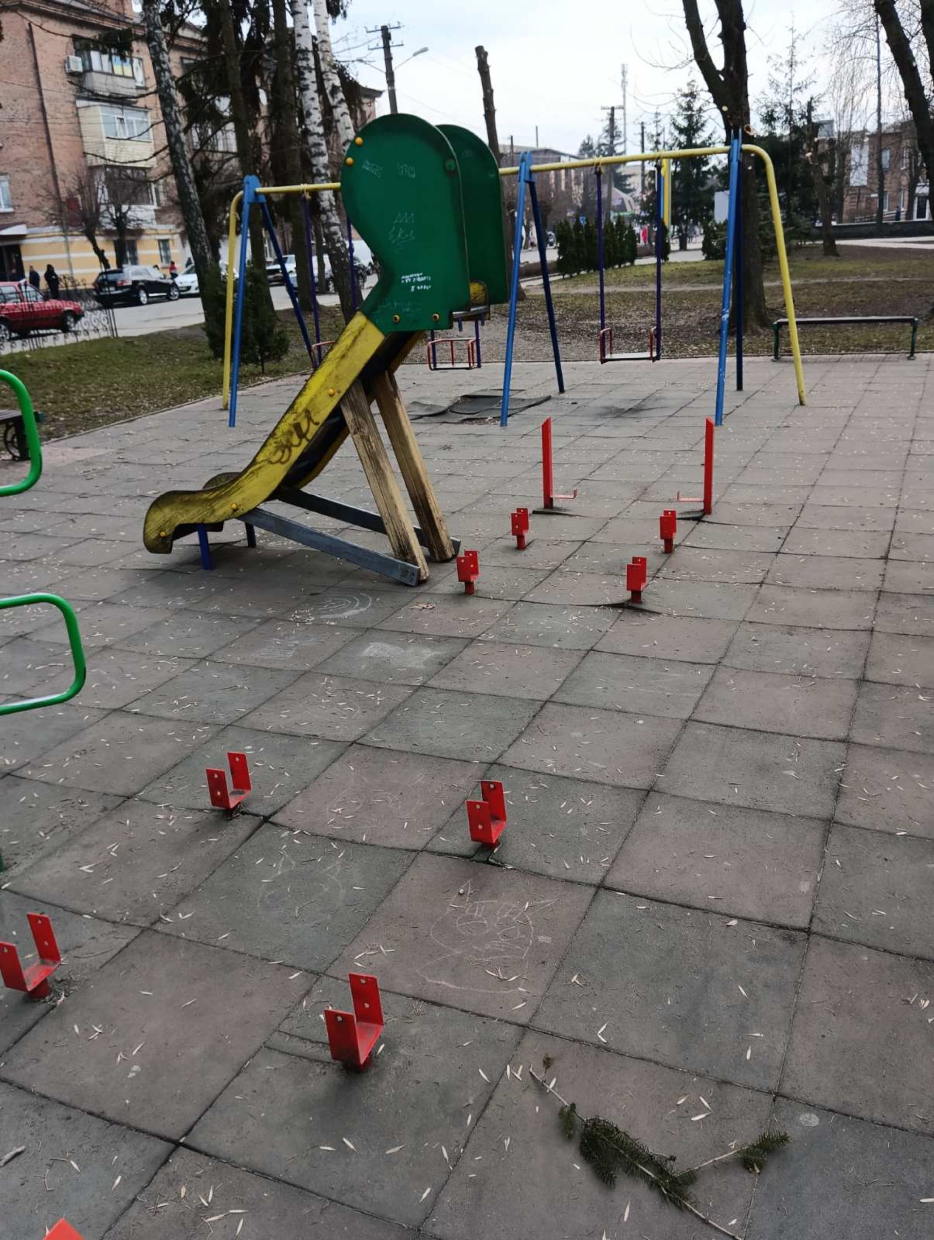 - З того часу пройшло вже більше місяця, а майданчик і досі не відремонтували. Більше того, козятинчани знімають відео і скаржаться — діти бігають і граються, а поруч небезпечні металеві кріплення, схожі на штирі