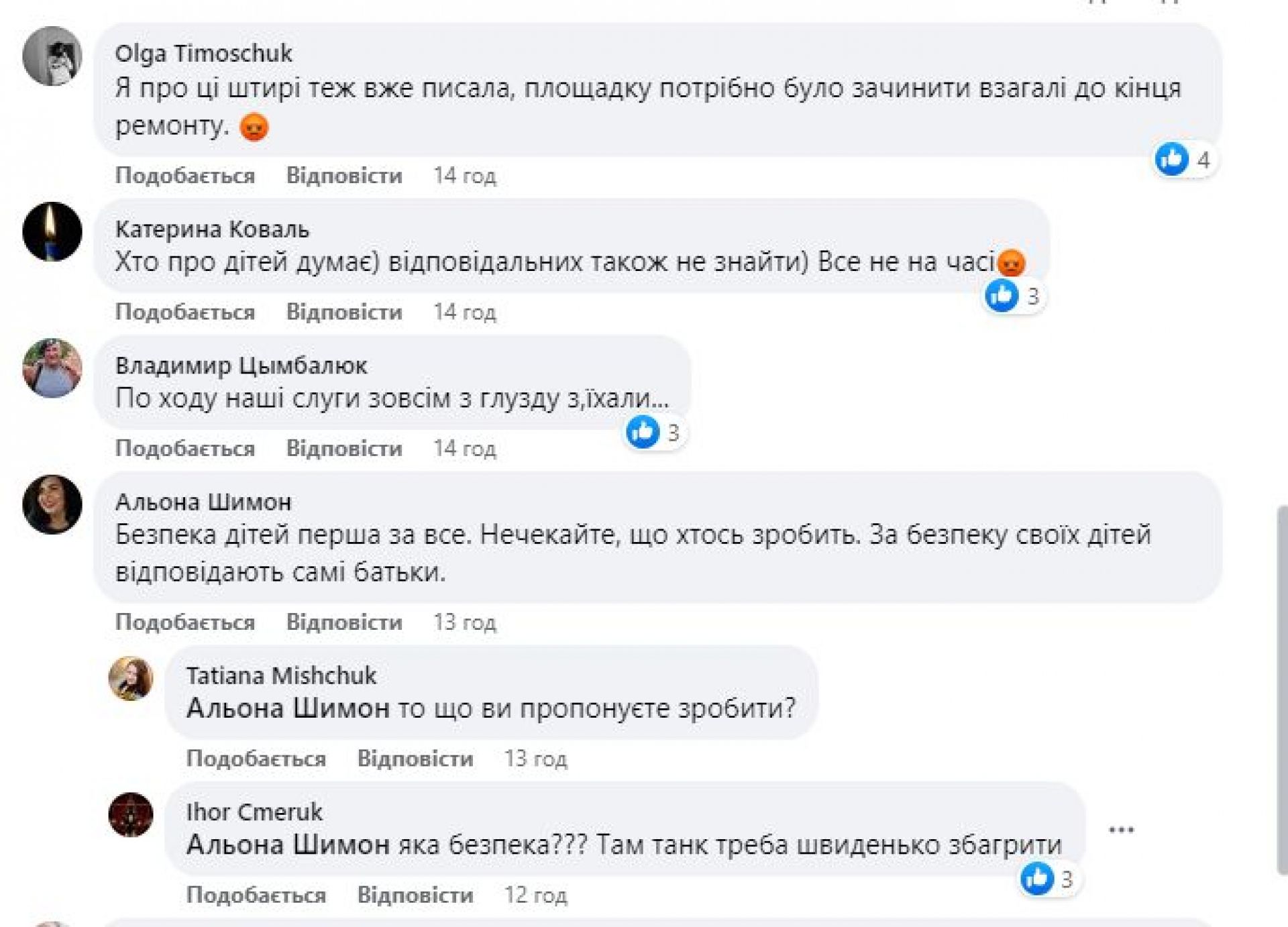 «Поставлю це питання на контроль в управлінні ЖКГ. Маєм дуже прикру ситуацію по стану споруди, майданчики всі передані на баланс «Чистого міста», багато з них встановили і не закріпили для обслуговування, впевнена була, що процес налагоджений і контролюється. Ніхто не відміняв людський фактор, там щоденно працює двірник, вона мала донести це до керівництва. Безпека дітей на першому місті. Найближчим часом працівники приведуть у відповідність майно, відремонтують, замінять і встановлять неіснуючі деталі. Фарбувати будуть при сприятливих погодніх умов», — написала Тетяна Єрмолаєва на офіційній сторінці у фейсбук.