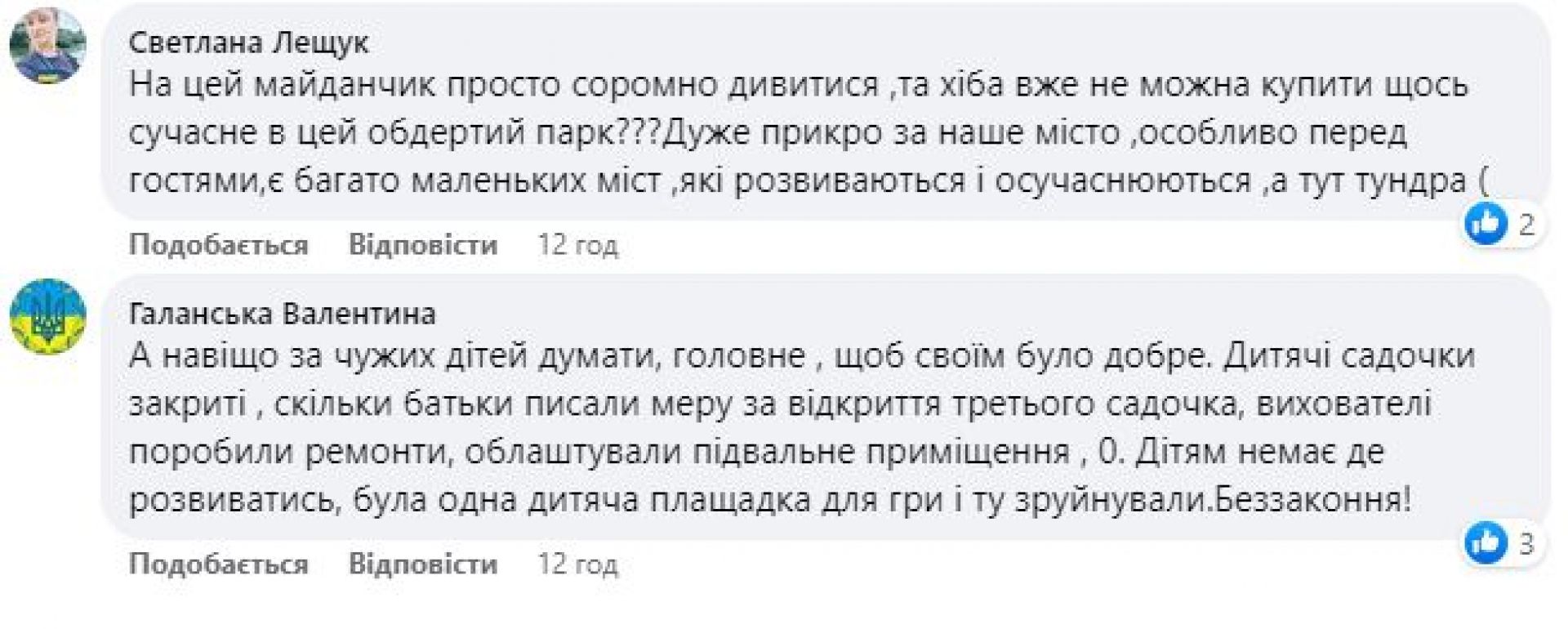 — Прийшли вперше в цьому році в парк і просто в шоці. Частину іграшкового комплексу відремонтували, а іншу частину зняли і просто залишили травмонебезнечні штирі Діти бігають , і раптом, хтось впаде це просто жах… Будьте обачні… — написала Людмила Семенюк