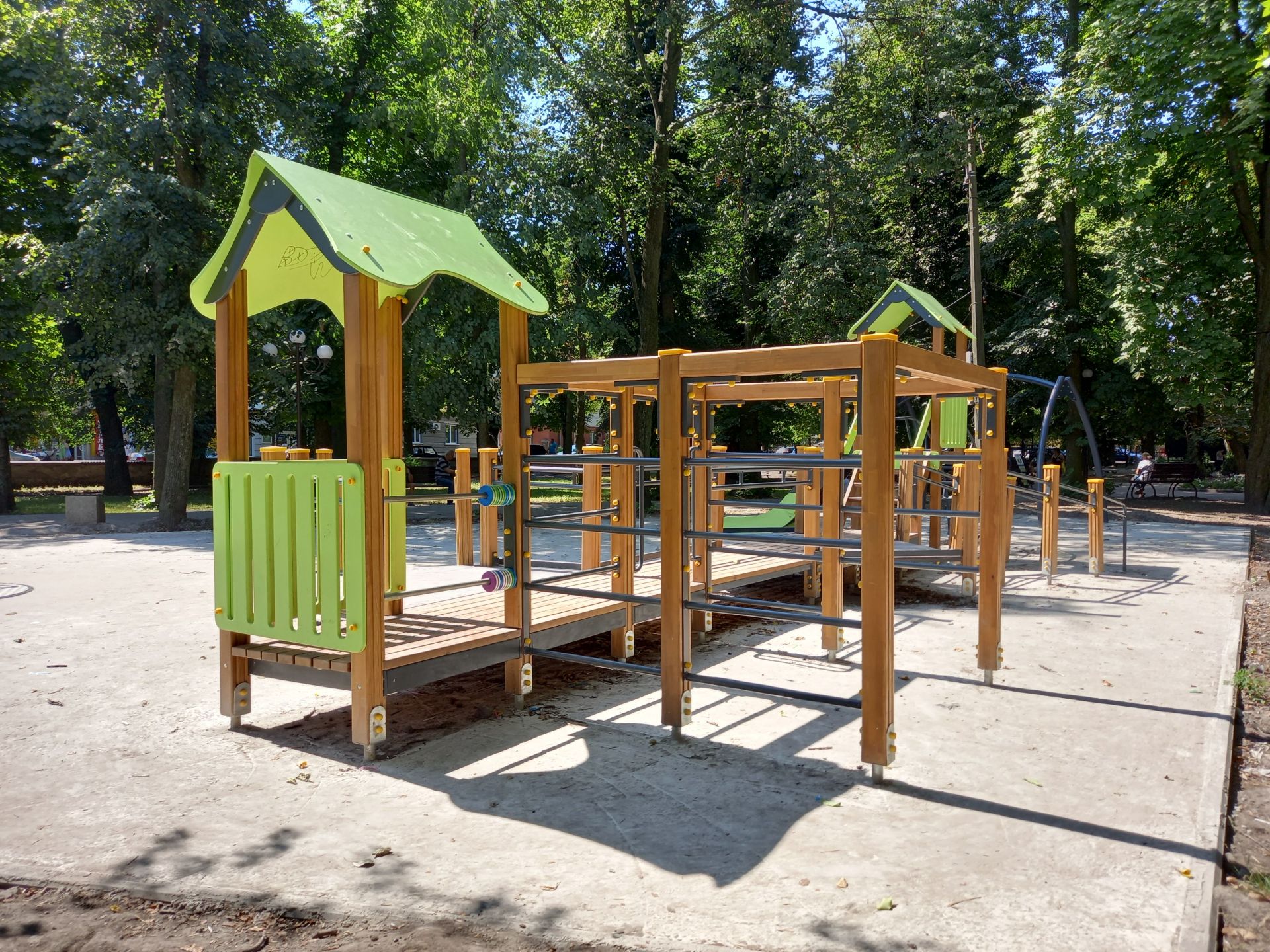 Вівторок, 23 липня, 11 година дня. У міському сквері розвантажують вантажівку. Дістають бетонозмішувачі. Мішки, імовірно з цементом всередині, кладуть поруч. Із них вже виросла чимала гора. Усе це відбувається біля території незавершеного дитячого майданчика, який почали монтувати у парку навесні.