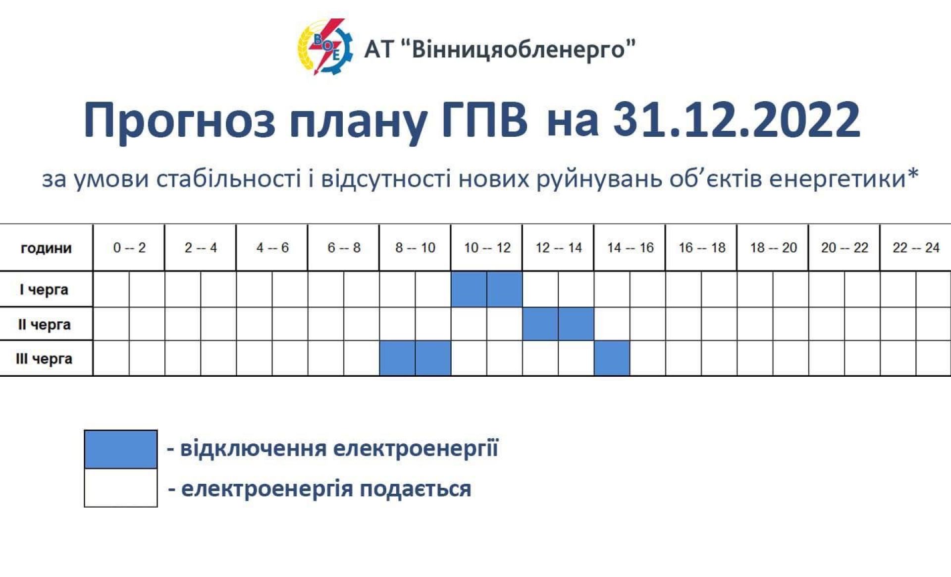 - У «Вінницяобленерго» опублікували графік погодинного знеструмлення, який діятиме протягом 31 грудня.