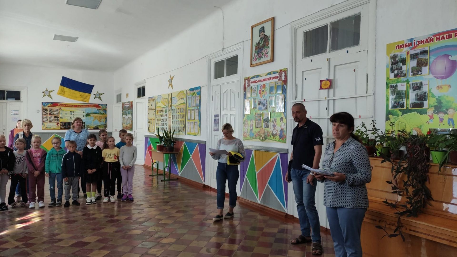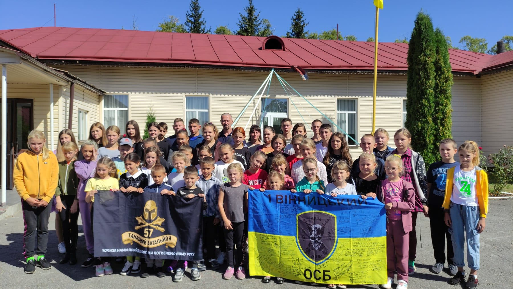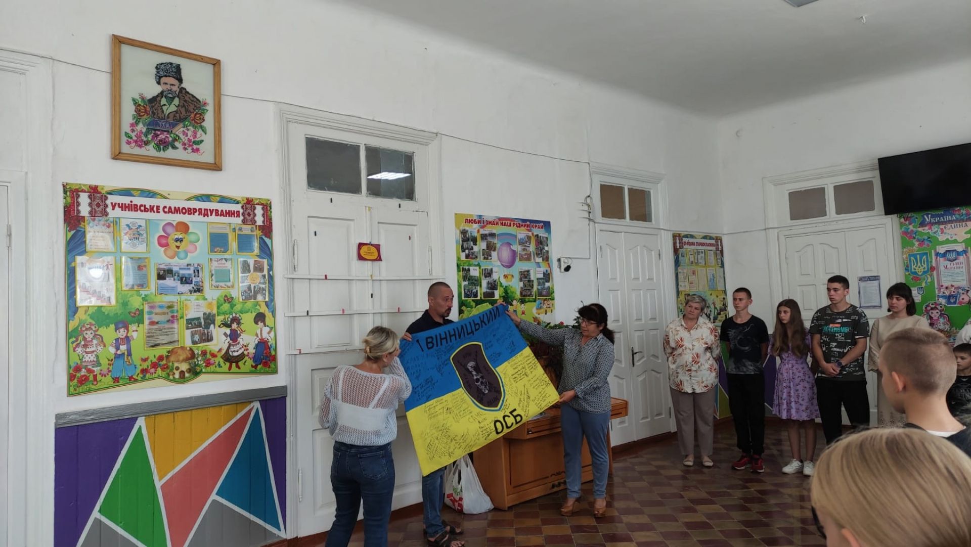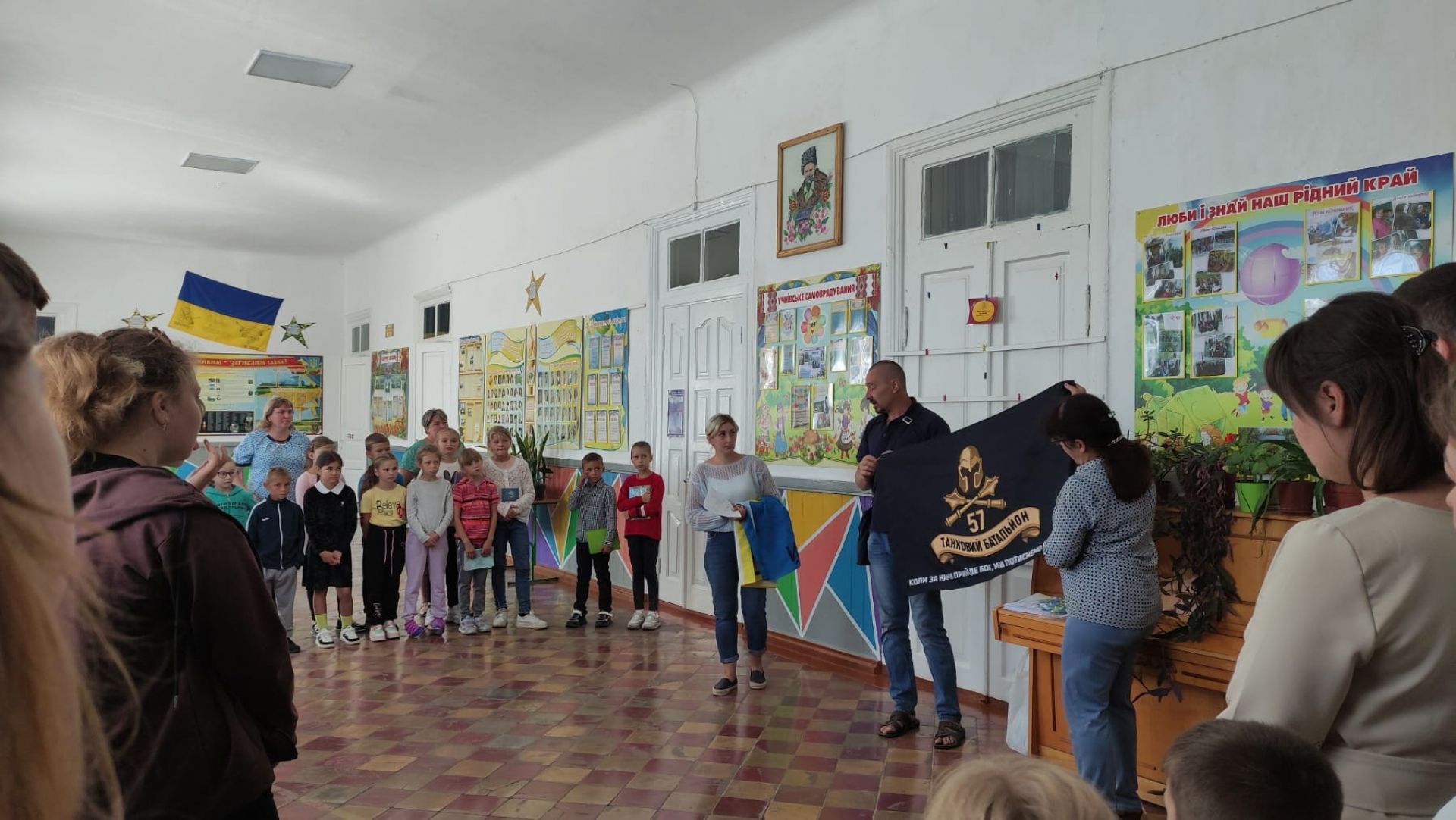 - Воїн вручив учням школи два прапори: один від воїнів 57-го танкового батальйону, у якому він служить, а другий — від 1-го Вінницького ОСБ, під прапором якого захищає нашу землю випускник школи Андрій Заїров.