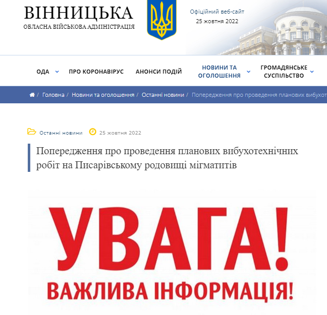 - Вінницька обласна військова адміністрація попереджає про проведення планових вибухотехнічних робіт на Писарівському родовищі мігматитів