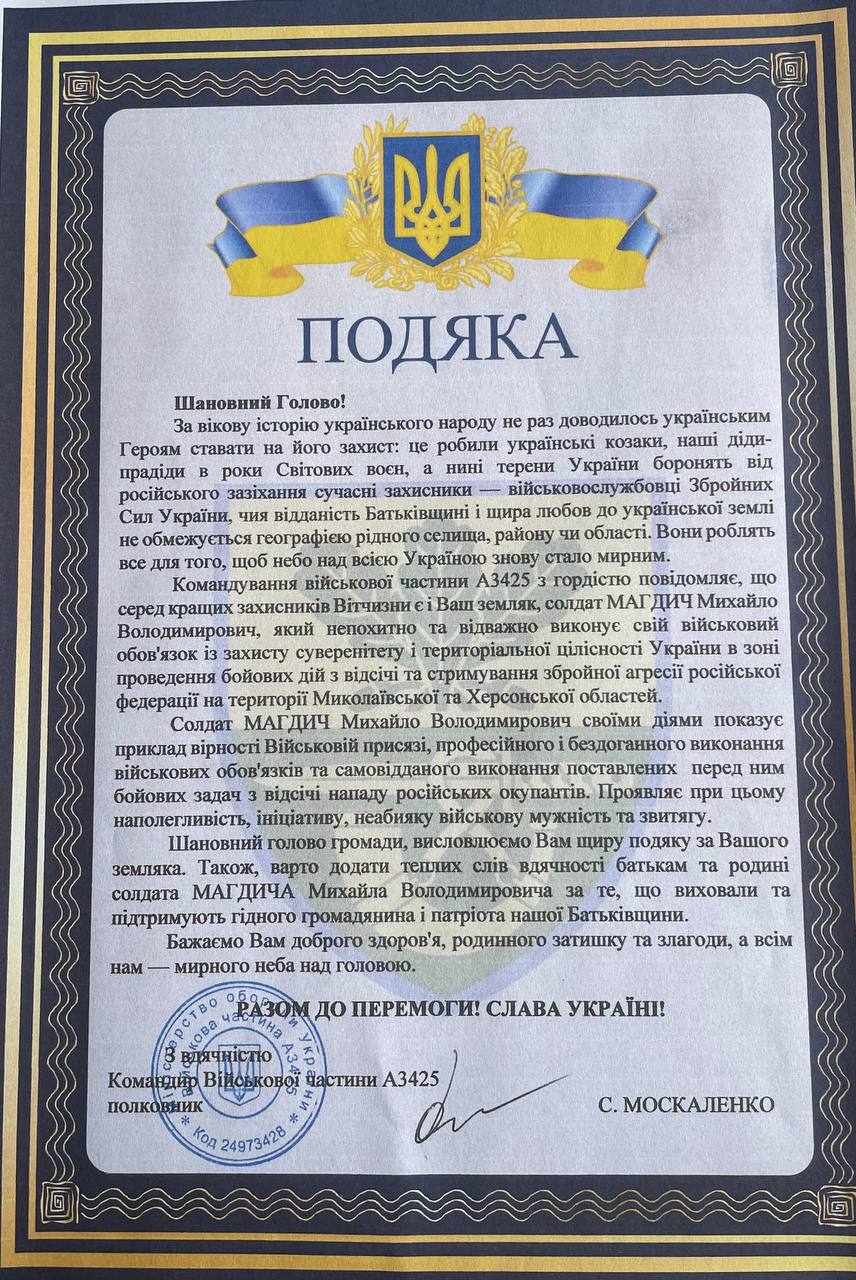 — Михайло Магдич разом зі своєю сім’єю, завітав до сільської ради, де сільський голова Сергій Лановик, в присутності працівників апарату сільської ради, зачитав та урочисто вручив лист-подяку Михайлу, який є «одним із кращих захисників Вітчизни, який непохитно та відважно виконує свій військовий обов’язок із захисту суверенітету і територіальної цілісності України в зоні проведення бойових дій з відсічі та стримування збройної агресії російської федерації на території Миколаївської та Херсонської областей» — йдеться у тексті листа.