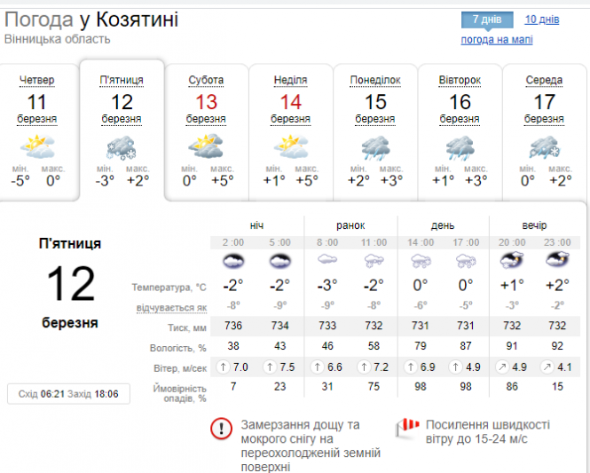 «12 березня вночі у західній частині, вранці та вдень в Україні, крім східних областей, пориви вітру 15-20 м/с, на дорогах країни, крім південного сходу, ожеледиця; в Карпатах пориви вітру 25-30 м/с, хуртовина, вночі значний сніг (I рівень небезпечності, жовтий), — йдеться у повідомленні.