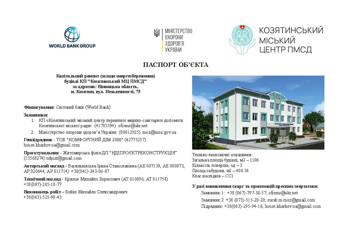 Спільний проєкт Міністерства охорони здоров’я України та Світового банку має назву «Зміцнення системи охорони здоров’я та збереження життя» (HEAL Ukraine), «Капітальний ремонт (заходи енергозбереження) будівлі «Козятинського центру міської медико-санітарної допомоги». У планах провести загальну теплоізоляцію зовнішніх стін будівлі та покрівлі, а також повний ремонт покрівлі із застосуванням протипожежних заходів. Капітальний ремонт має завершитись до кінця поточного року. Проєктувальник — Житомирська філія «НДПРОЕКТРЕКОНСТРУКЦІЯ», генпідрядник ТОВ «Комфортний дім». Що стосується фінансів — це цільові кошти відповідно до спільного проєкту Міністерства охорони здоров’я України та Світового банку «Зміцнення системи охорони здоров’я та збереження життя» (HEAL Ukraine). Вартість — 8,5 мільйона гривень. Проєкт створюється повністю Світовим банком, тобто без вкладень з міського бюджету. Виділені кошти не можуть бути перенаправлені на інші видатки. Реалізація проводиться з урахуванням та з дотриманням екологічних і соціальних стандартів Світового банку та з дотриманням документів, що регулюють управління екологічними і соціальними питаннями.