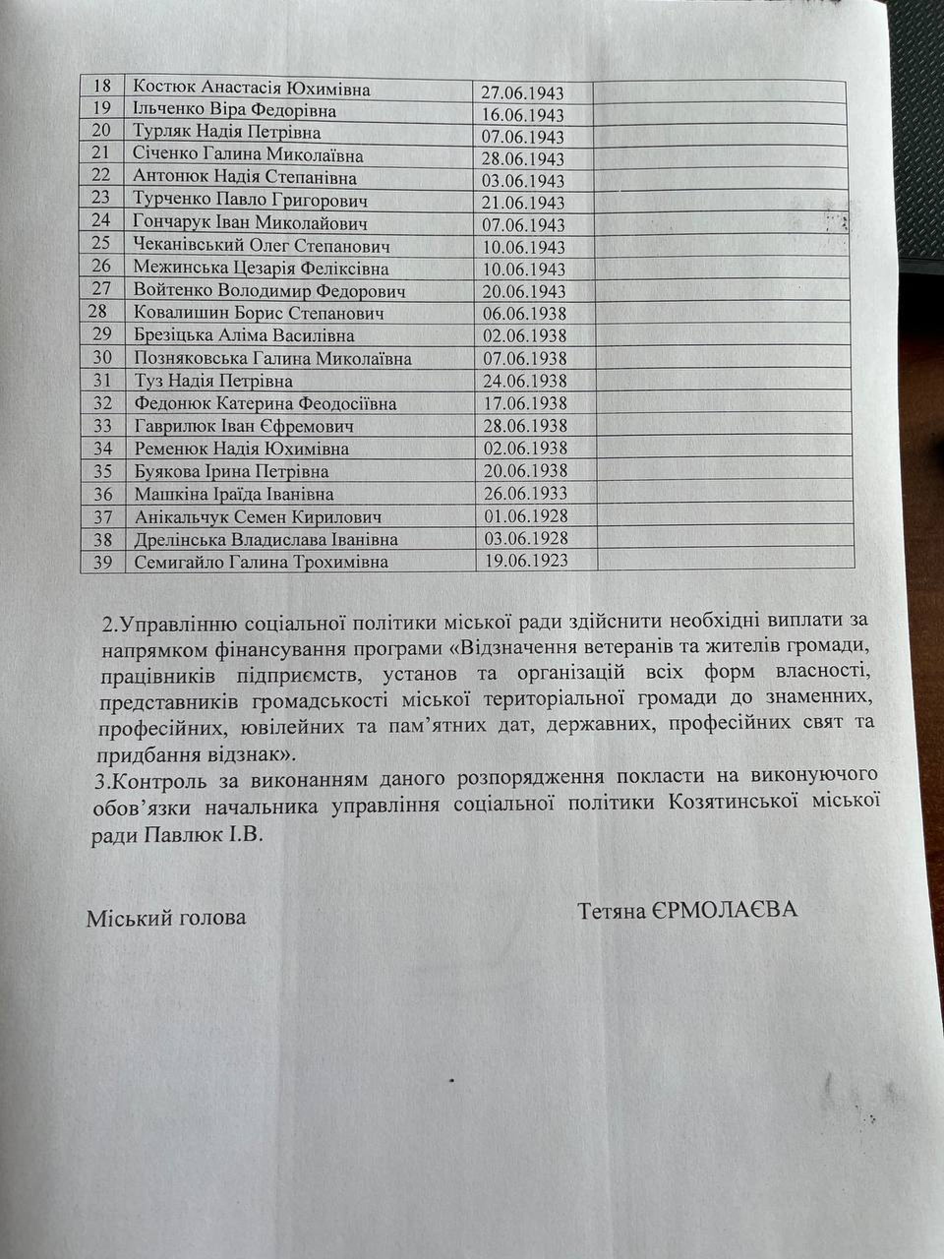Нижче у дописі міський голова додала розпорядження із ювілярами червня 2023 року. У списку їх 39.