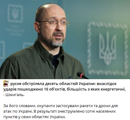 Нагадаємо, вранці російські військові здійснили масований обстріл України, є влучання в об'єкти критичної інфраструктури. З понад 50 крилатих ракет силам ППО вдалося збити 44. Тим часом прем'єр Шмигаль повідомив про 18 пошкоджених об'єктів у десятьох регіонах України.